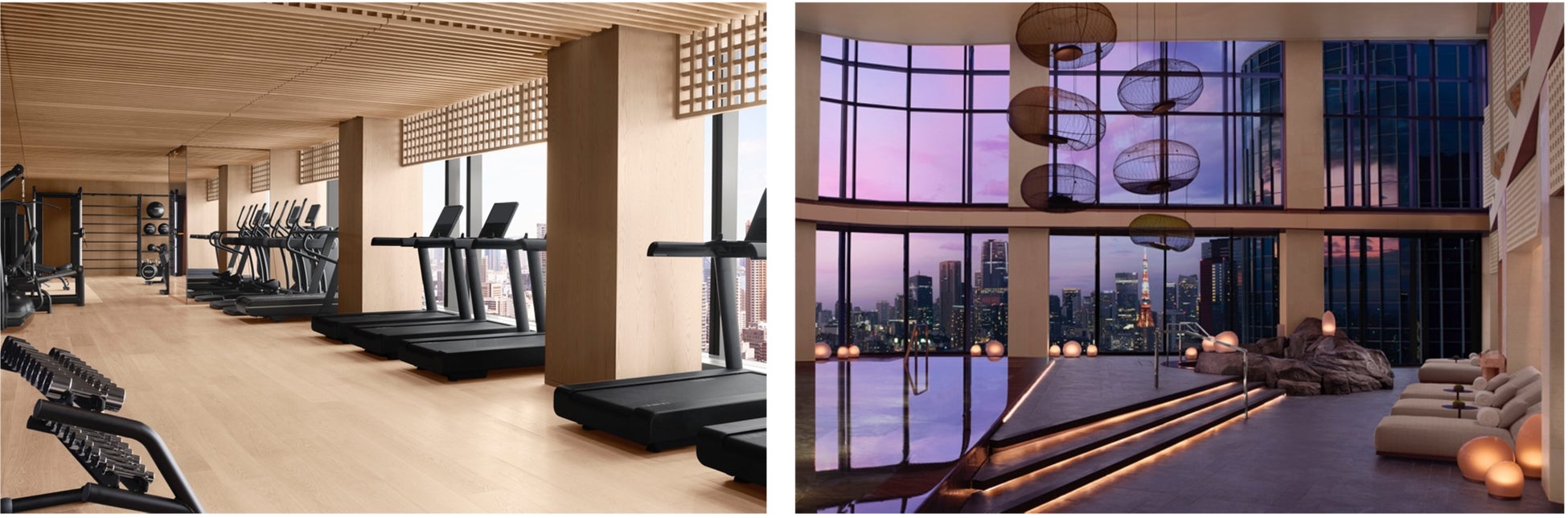 ウェルネス施設として、ホテル高層階(28階)に位置する屋内プールは、東京・高輪の街並を臨むパノラマビューが広がる静けさに包まれた癒やしの空間で、全長25mのプールとウィールプール(ジェットバス)を備え、トレーニング後にはドライサウナ、スチームサウナも完備。マインドフルアワーも設けています。24時間利用可能なフィットネスセンター(28階)には、最新の有酸素運動マシンやテクノジム製のストレングスマシン、フリーウェイトスペースが備えられています。トレーニングルームでは、モーニングヨガ(7:00~8:00、無料、要予約)や、パーソナルトレーニング(有料、要予約)も利用可能です。