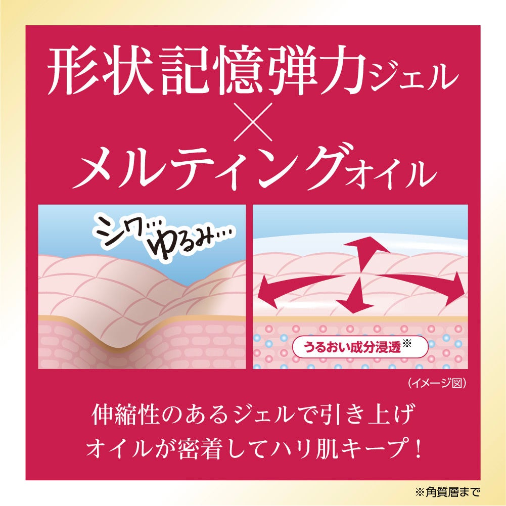 伸縮性のある形状記憶弾力ジェルで引き上げ、メルティングオイル*⁴が肌にピタッと密着する「Wリフト」がポイントです。