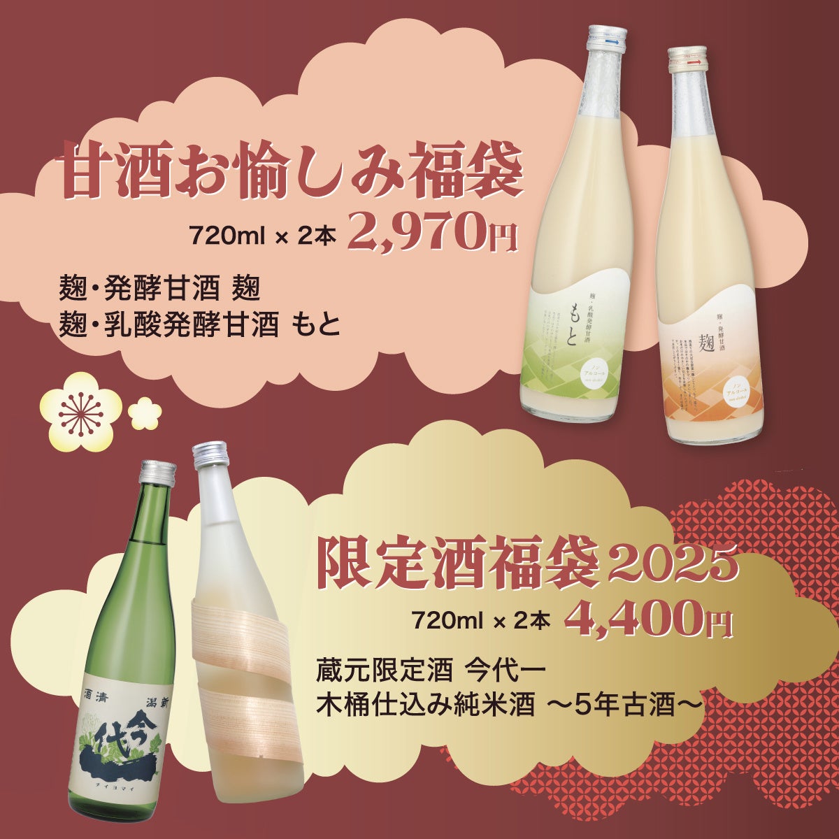 寒い冬にはホットでもおいしい甘酒と、飲むヨーグルトのような酸味がクセになる甘酒をセットにした福袋。どちらもノンアルコールなので、小さなお子様や妊婦さんでも安心して召し上がれます。