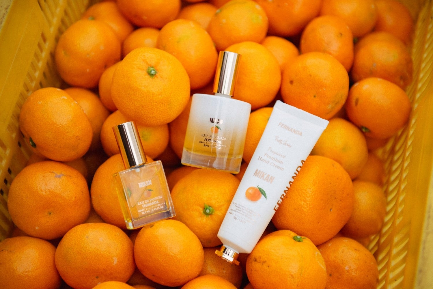 果実を丸ごと絞ったようなジューシーなみかんに、爽やかな甘さと酸味が特徴のオレンジ、ほんのりスパイシーなドライウッディーを重ね、フェルナンダオリジナルの心あたたまる“みかん”の香りに仕上げました。寒い冬にそっと寄り添う、心安らぐ香りです。