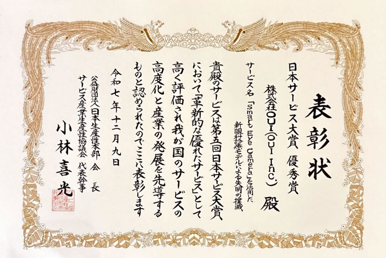 慶應義塾大学医学部発のベンチャー企業 OUI Inc.(ウイインク)は、第5回「日本サービス大賞」において、「Smart Eye Cameraを活用した新眼科診療モデルによる失明の撲滅」が、「革新的な優れたサービス」として優秀賞を受賞したことを報告します。