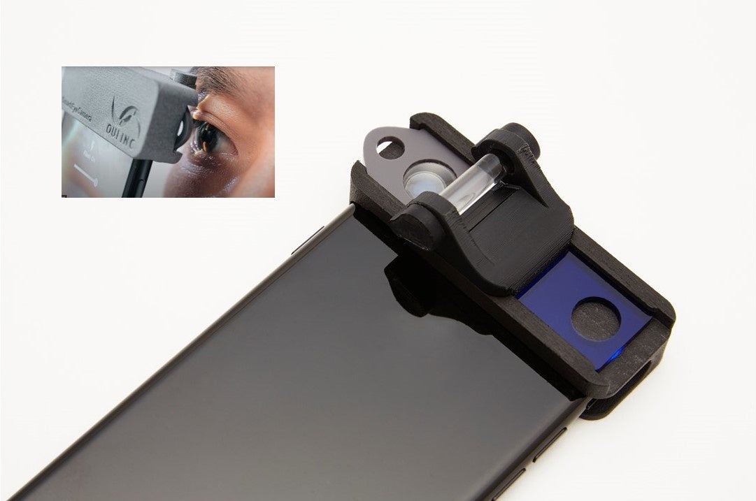 遠隔眼科診療を可能にするスマホアタッチメント型機器:多くの眼科疾患の診断が可能な、医療機器として登録されたスマホアタッチメント型機器で、遠隔眼科診療という革新的な診療を可能にした点。