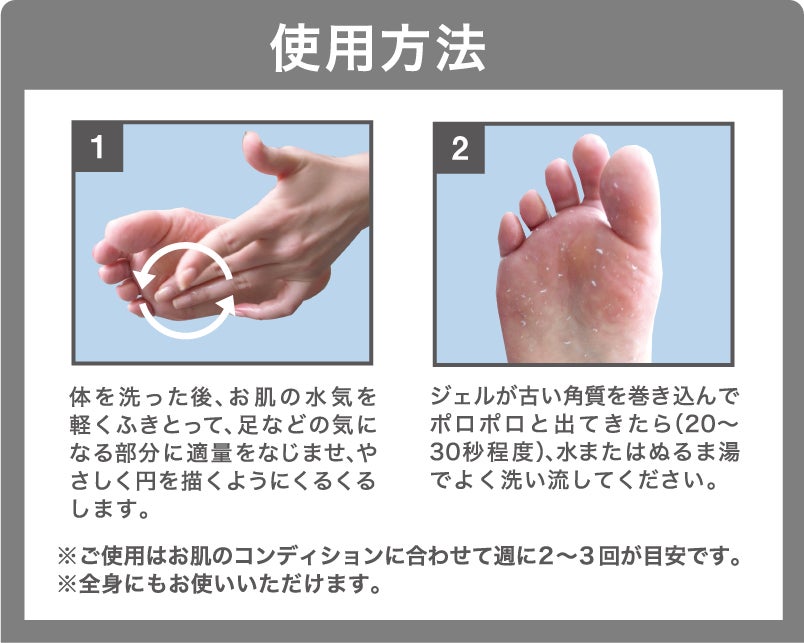 「footy 薬用フットポロポロジェル(医薬部外品)」は殺菌効果のある薬用のジェルで、足の裏などをくるくるするとニオイの原因となる古い角質をポロポロと絡め取ります。ニオイを原因から防ぎ、かかともつるすべに!