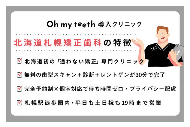 株式会社Oh my teeth(本社:東京都新宿区、代表取締役CEO 西野 誠、以下Oh my teeth)は、この度、「Oh my teeth」を導入する提携クリニックとして「北海道札幌矯正歯科」が12月12日(金)に新規開院することをお知らせします。同院は、北海道で初めてOh my teethの矯正システムを導入する医療機関となり、これによりOh my teethの導入拠点は全国9箇所※に拡大します。