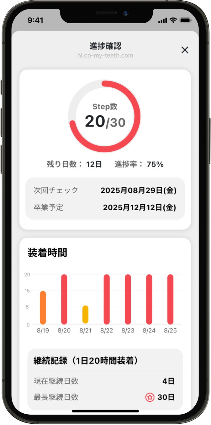 ・1日20時間以上の装着をお願いしています。装着状況は、歯の移動量や効果に影響します。