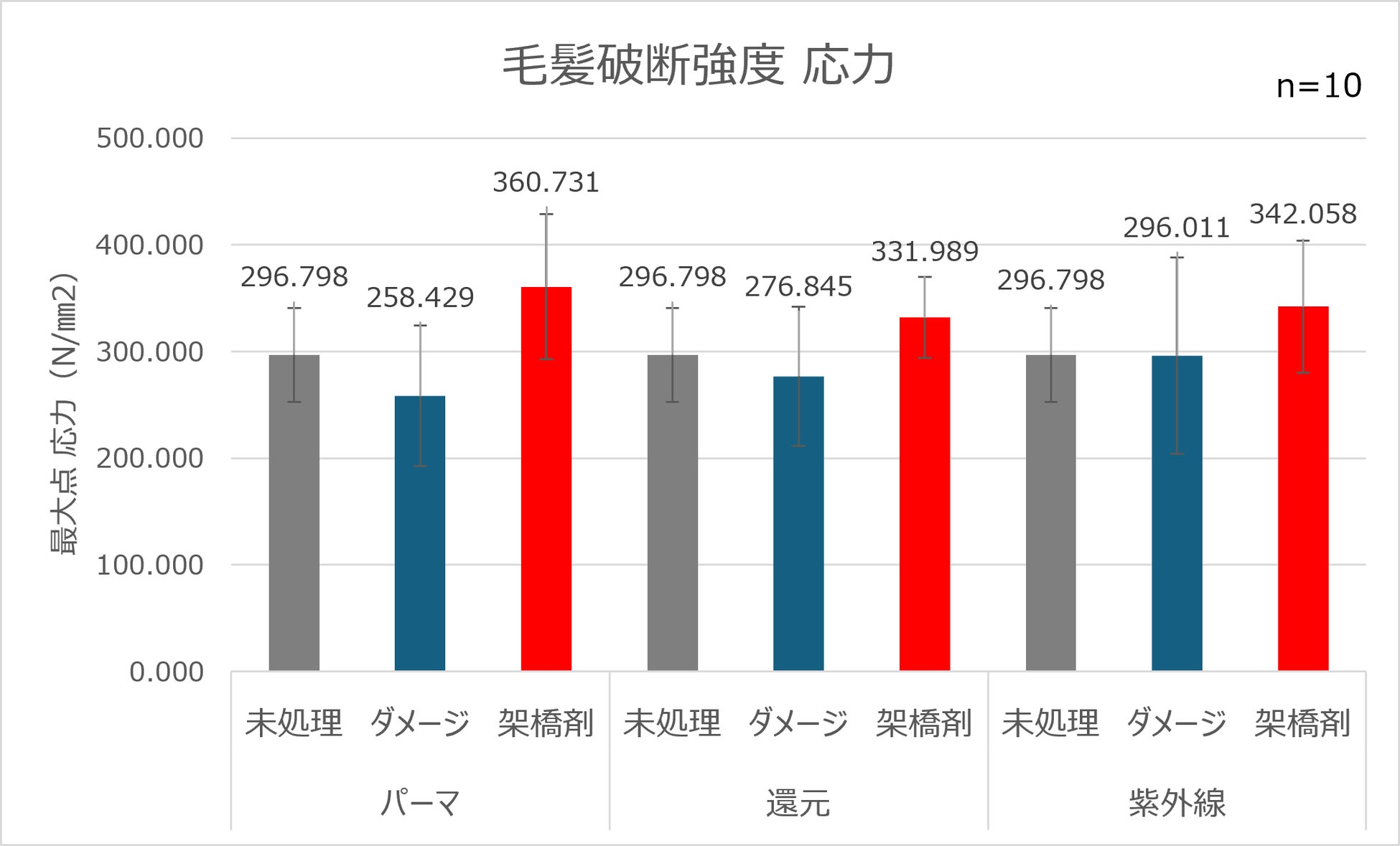 ラサーナを展開する株式会社ヤマサキとクローダジャパン株式会社は、パーマ処理・紫外線照射・還元処理などによって低下した毛髪破断強度が、架橋剤の処理によって上昇することを実証しました。毛髪内部の切断されたシスチン結合を再架橋し、健常毛レベルまで強度を回復できることを確認したこの成果は、ラサーナが長年積み重ねてきた研究と技術開発によって初めて実現したものです。
