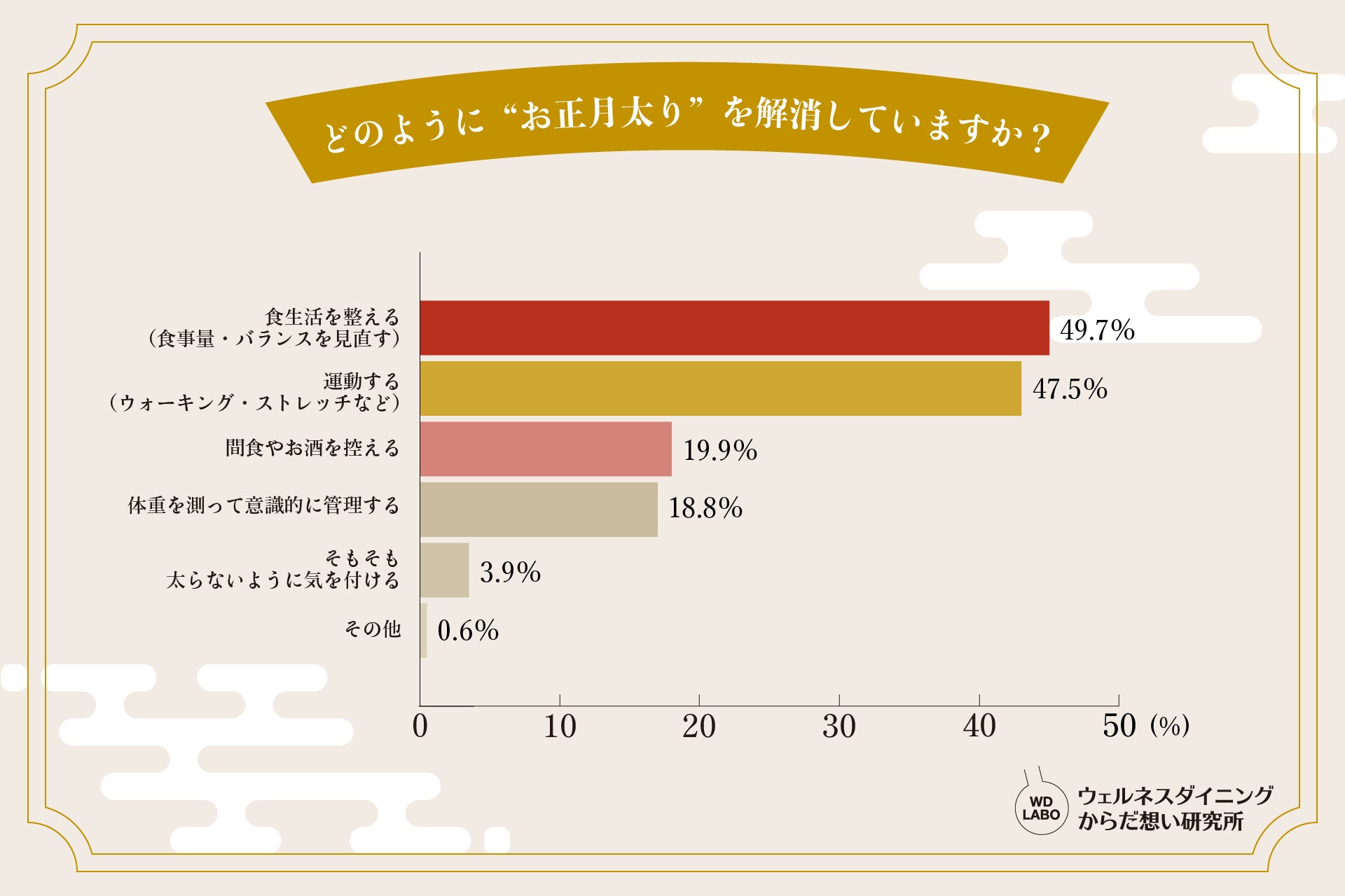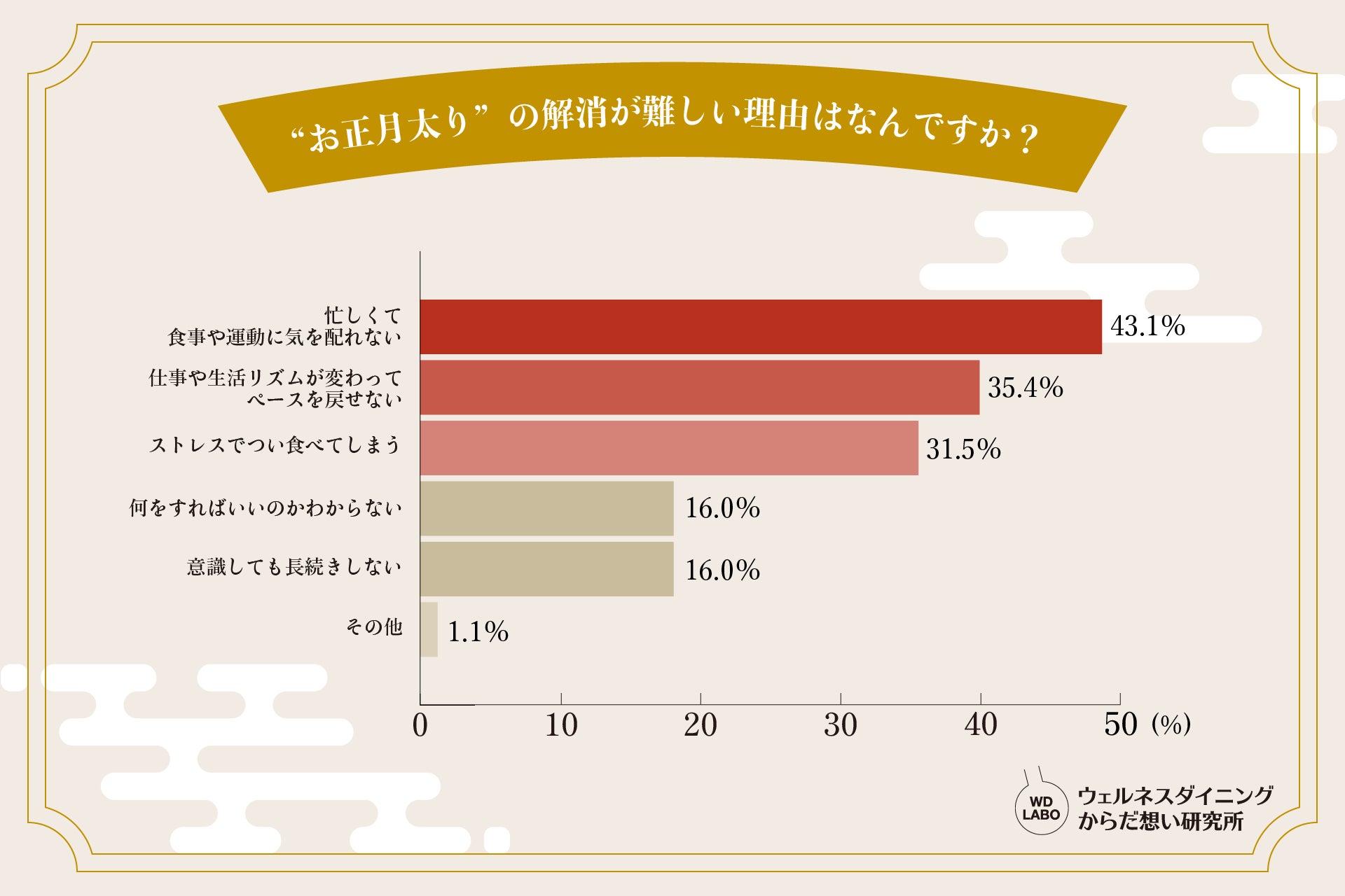 ウェルネスダイニング株式会社(本社:東京都墨田区、代表取締役:中本哲宏)は、10代から50代の男女を対象に「お正月太りに関する調査」を実施しました。その結果、約6割が「正月太りを経験したことがある」と回答し、原因として「おせちやごちそうなど高カロリーな食事」「間食や甘いものの食べすぎ」「運動不足」などが挙げられました。一方で、解消法としては「食生活の見直し」や「運動」を挙げる人が多く、健康意識の高まりも垣間見える結果となりました。