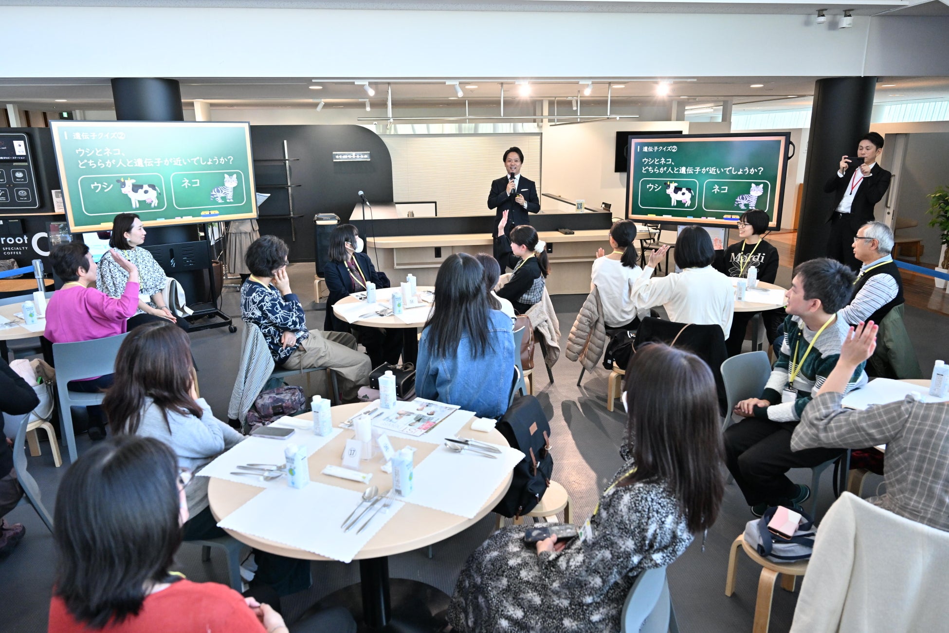 「人とバナナは何%遺伝子が一致している?」「人の遺伝子は何種類ある?」など、難しいイメージのある遺伝子を身近に感じてもらうことを目的に、クイズ形式で分かりやすく解説しました。