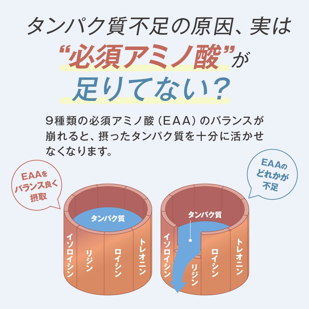 肌、髪、筋力、そして活力。年齢とともに減っていく“たんぱく質の活用力”に着目し、必須アミノ酸(EAA)で、食事の栄養をしっかり“使えるからだ”へ。栄養と美容を両立する新サプリメント