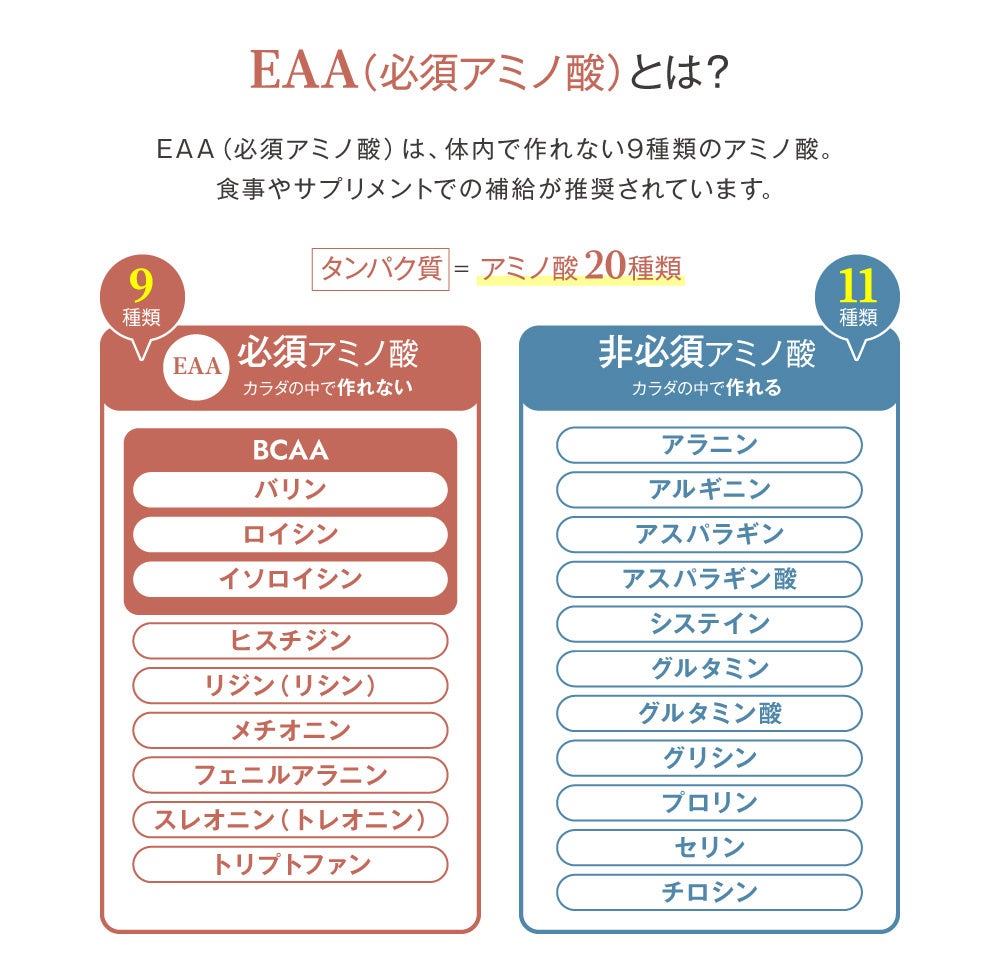 中でも体内で合成できない**必須アミノ酸9種(EAA)**は、