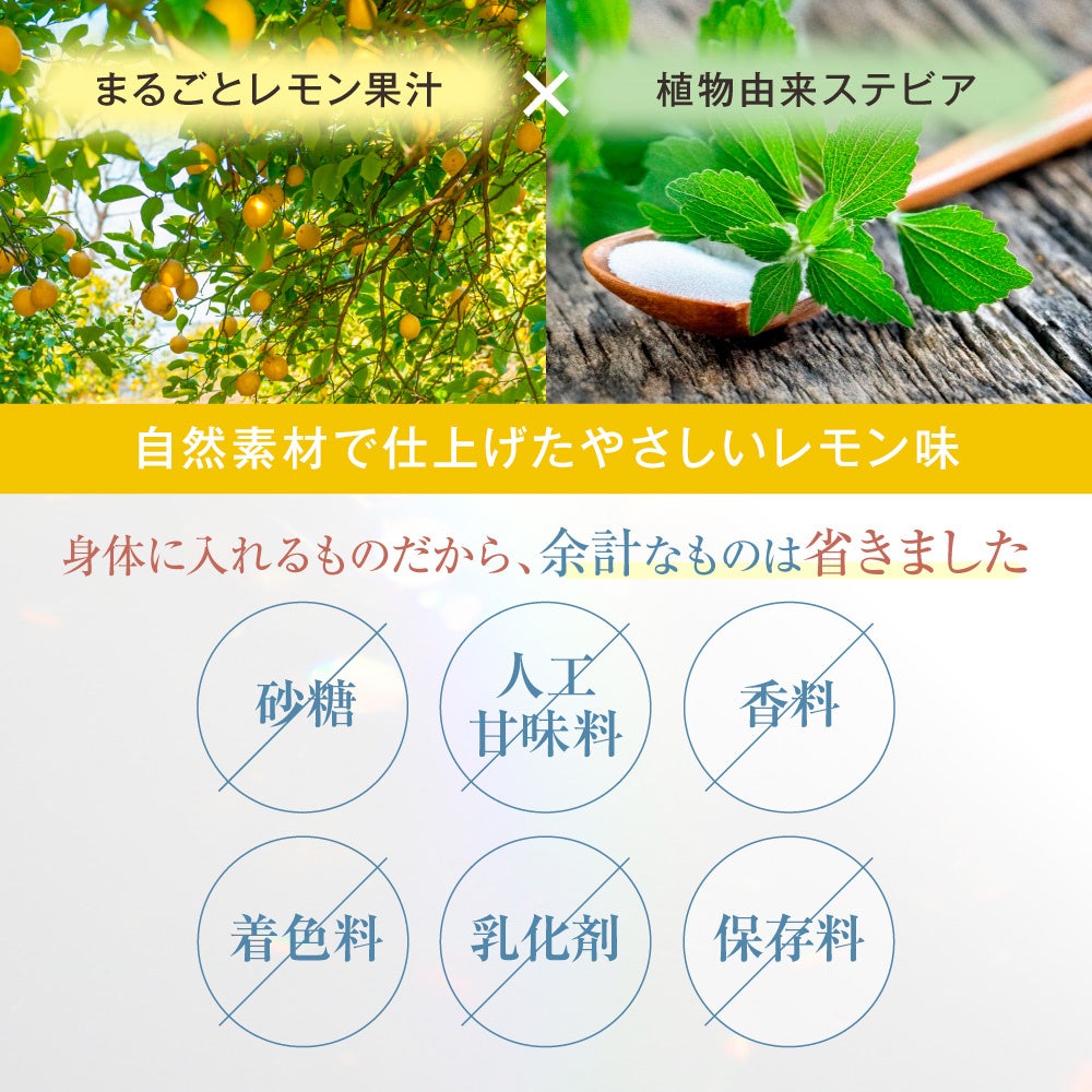 味は、植物由来のステビアとまるごとレモン果汁で自然な美味しさを実現。毎日でも飲みやすいスッキリレモン風味です。