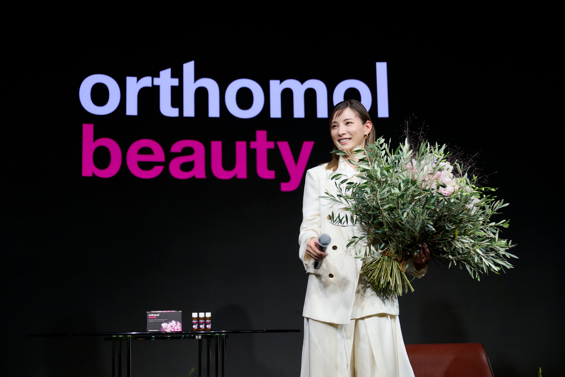 当日は俳優の加藤あいさんがご登壇し、美容と健康に対する想いや、日々のライフスタイルについてお話しいただいたほか、加藤あいさんのお誕生日もサプライズでお祝い。会場内は、デジタルとフィジカルを行き来するような没入感のある映像と、「オーソモル・ビューティ」の成分にも使用されているオリーブの木や世界観を表現したお花の空間演出と共に、美や健康について深掘りしました。