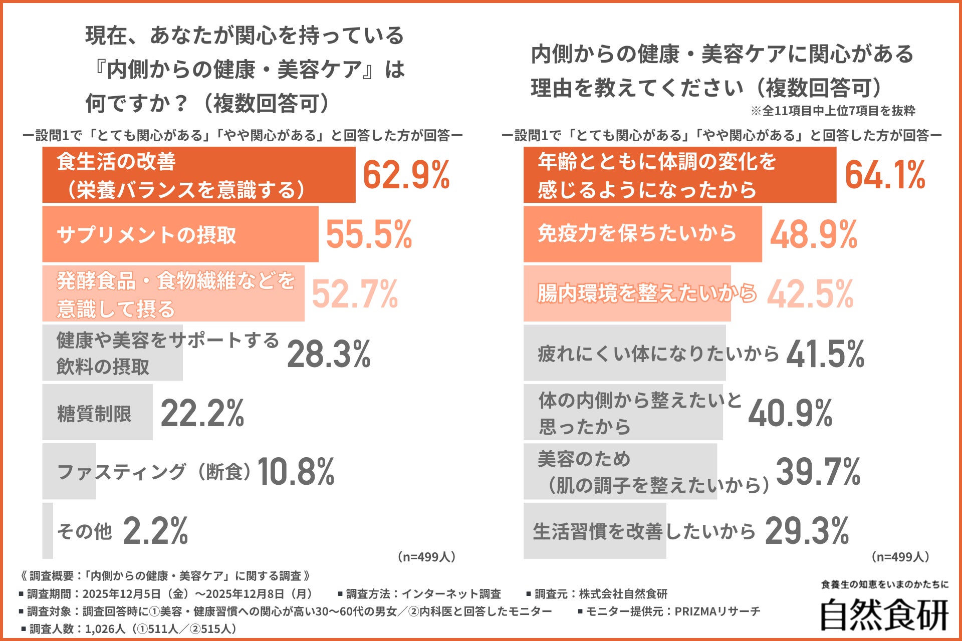 そこで今回、株式会社自然食研(https://www.sizenshokken.co.jp/)は、①美容・健康習慣への関心が高い30~60代の男女/②内科医を対象に、「内側からの健康・美容ケア」に関する調査を行いました。