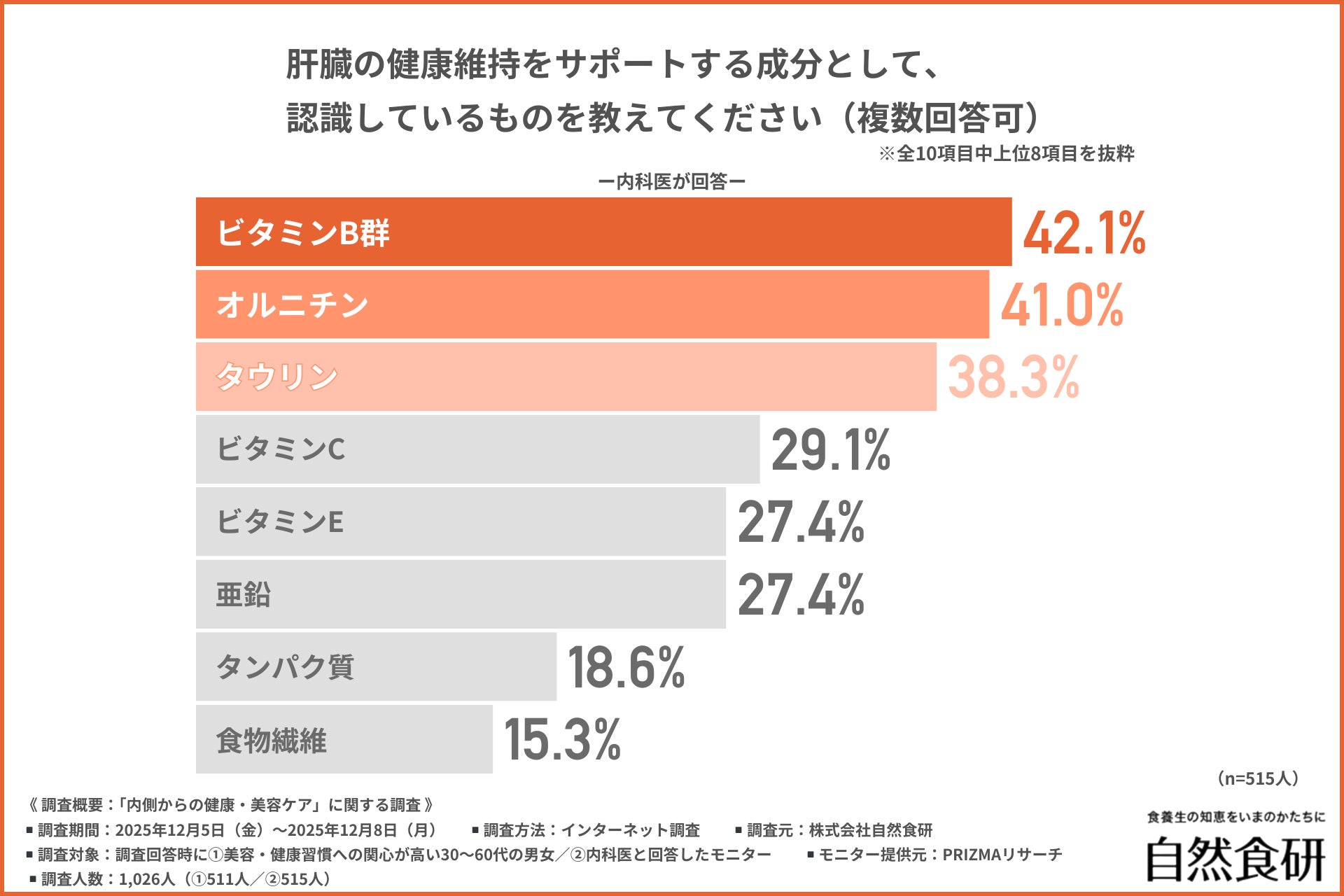 また、内科医への調査では、9割以上が「肝臓の状態は健康・美容に影響する」と回答し、特に「免疫機能の維持」や「代謝サポート」「疲労感」への影響が指摘されました。