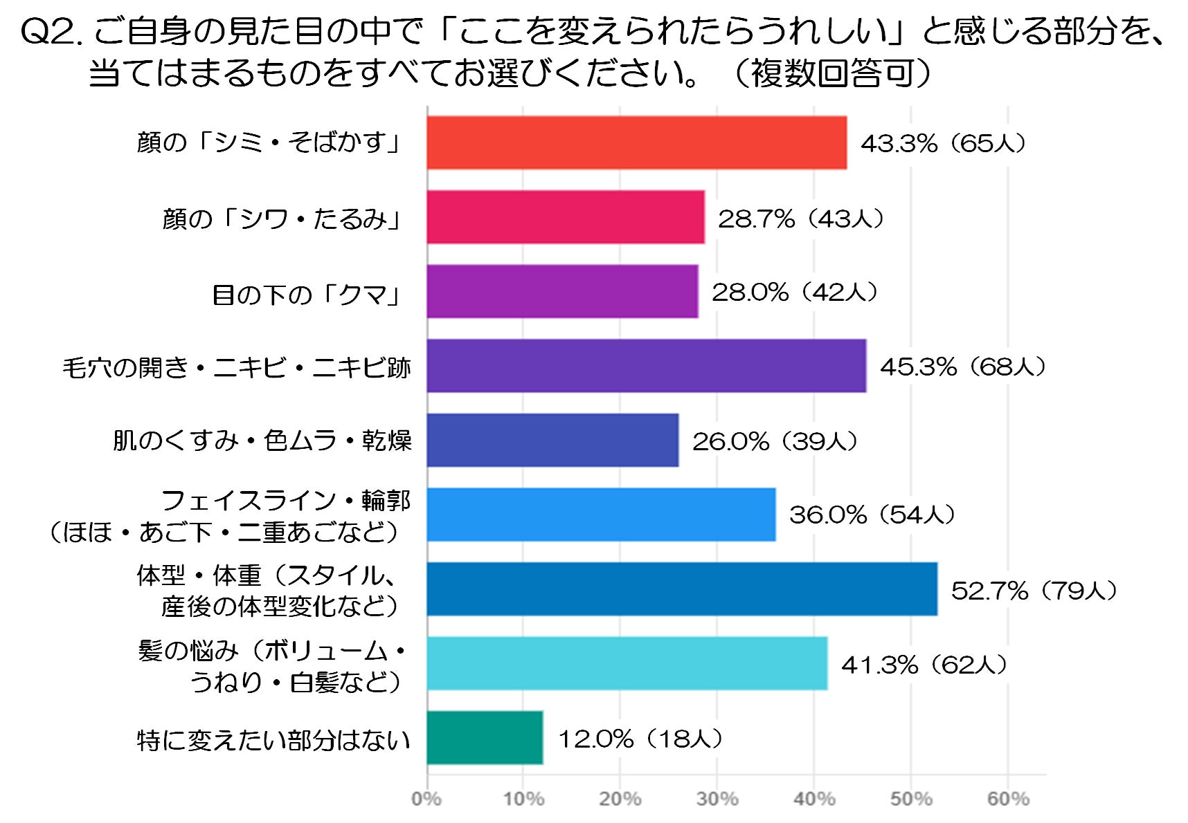 Q2. ご自身の見た目の中で『ここを変えられたらうれしい』と感じる部分を、当てはまるものをすべてお選びください。(複数回答可)