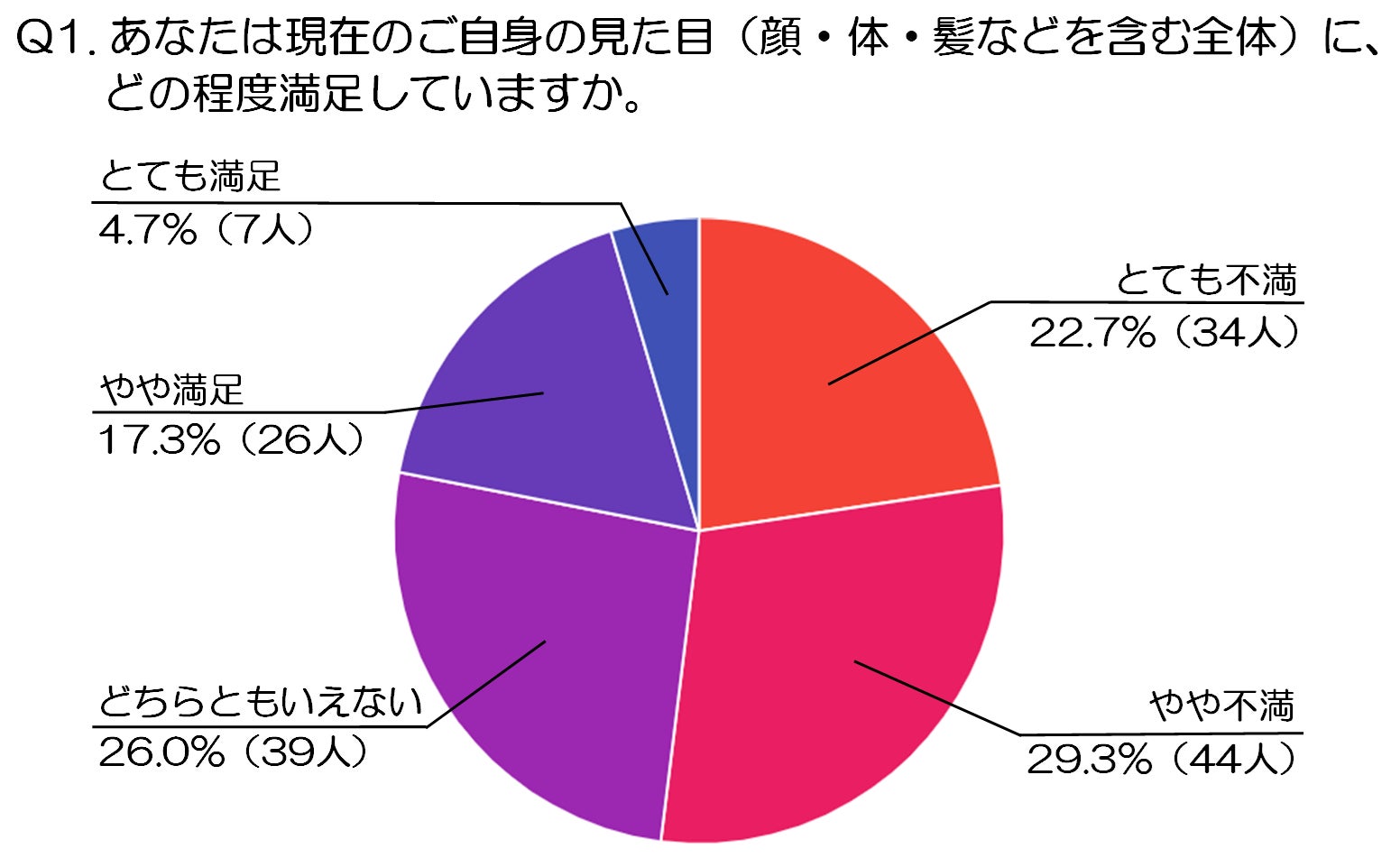 そして最も少なかったのが「とても満足」で4.7%(7人)で、自分の見た目を強く肯定できる人は極めて限られた割合にとどまりました。