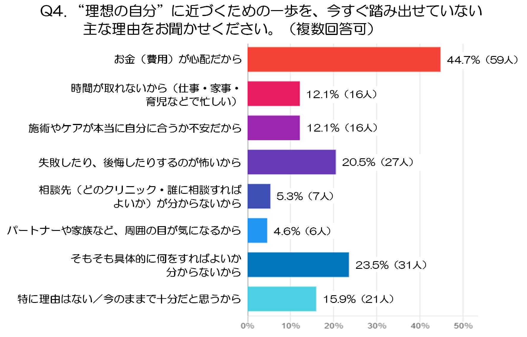 続く「失敗したり、後悔したりするのが怖いから」は20.5%(27人)で、施術の仕上がりや想像とのギャップを心配し、慎重になってしまう人が一定数いることが分かります。
