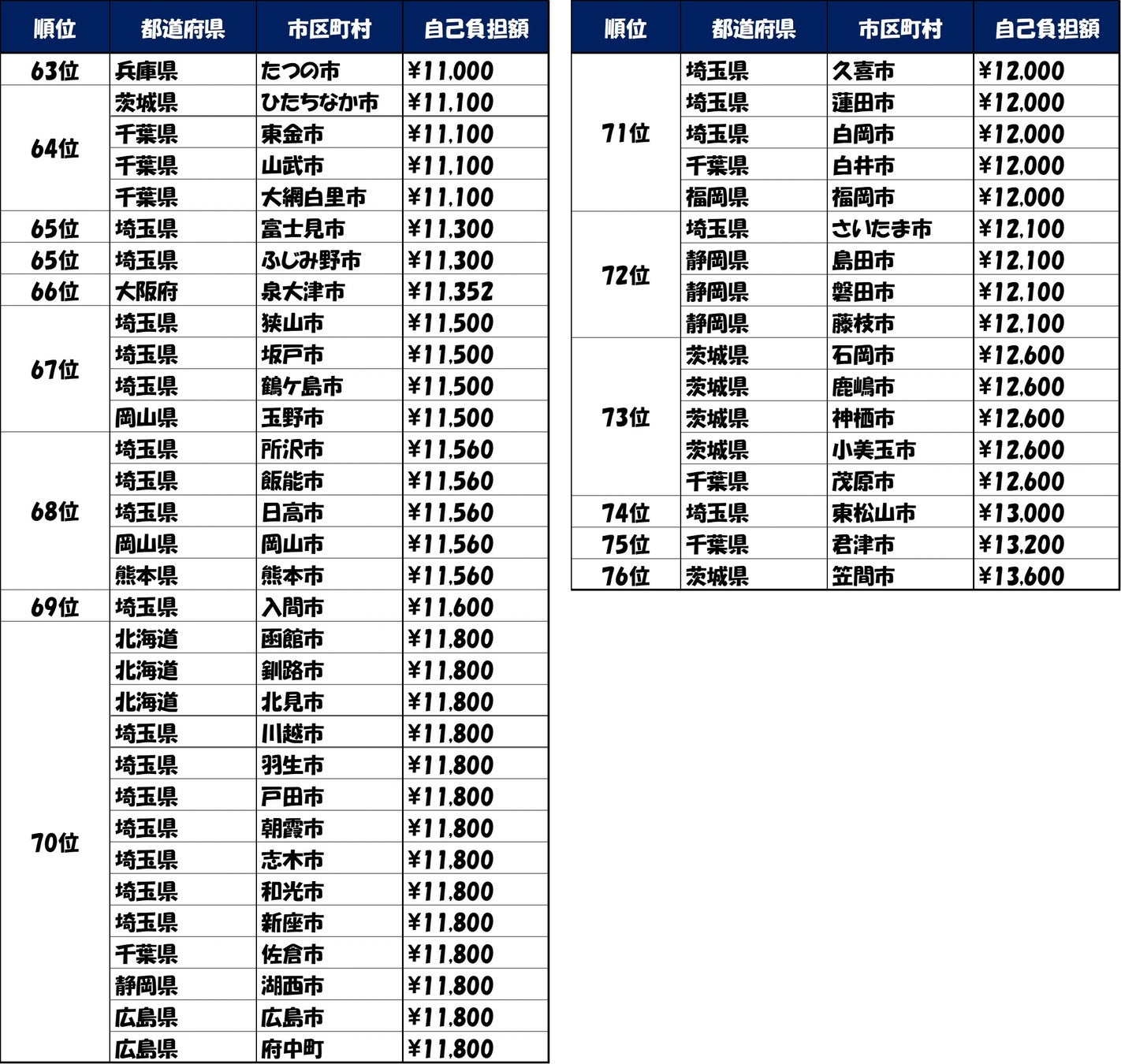 人口5万人以上の549自治体を対象にした自己負担額ランキングの一覧