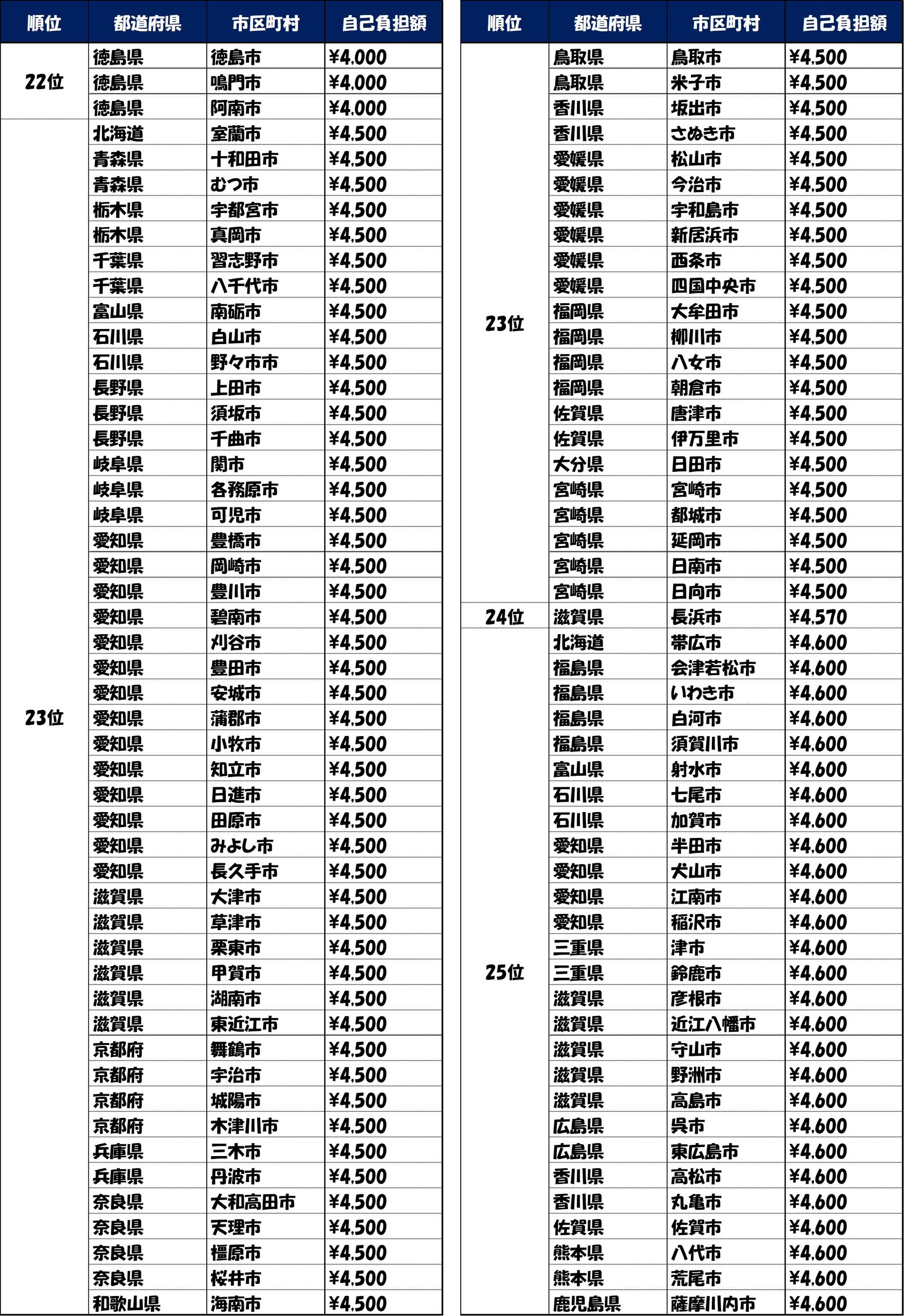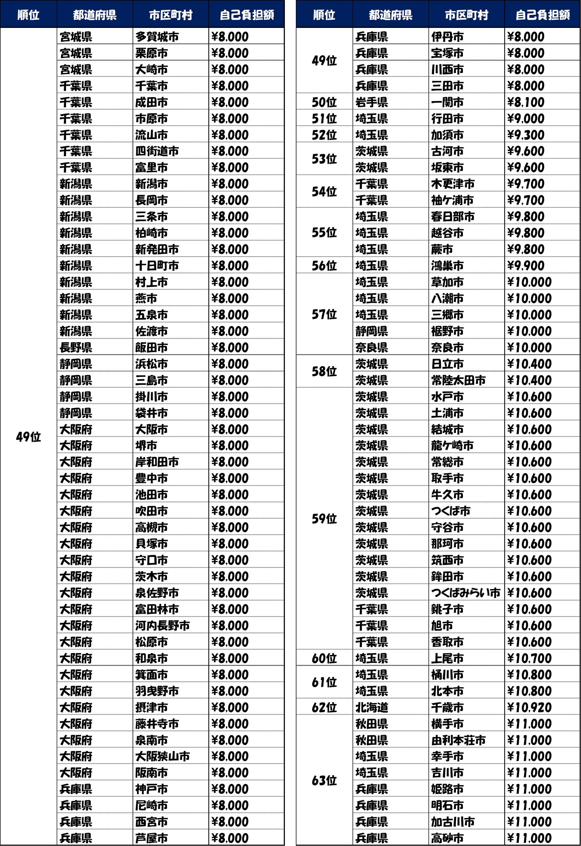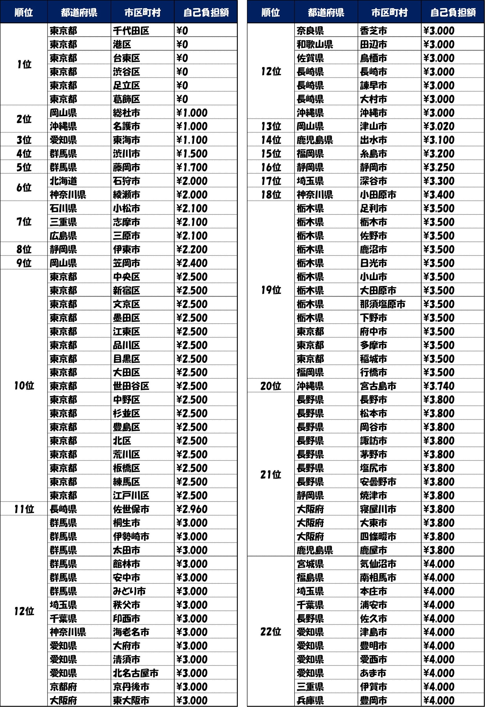 人口5万人以上の549自治体を対象にした自己負担額ランキングの一覧