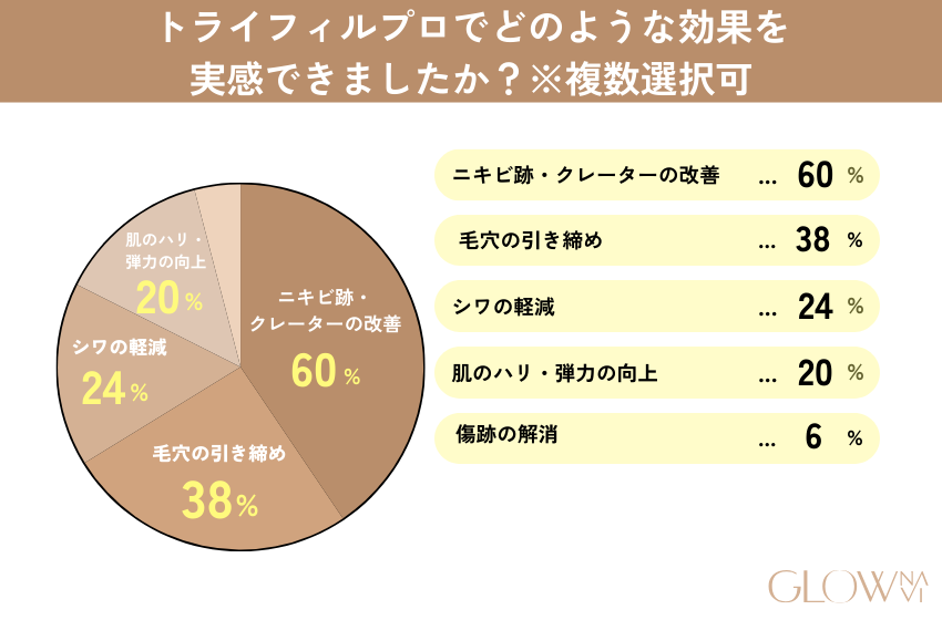 トライフィルプロの施術効果として、「ニキビ跡・クレーターの改善」を実感したと回答した方は全体の60%にのぼりました。
