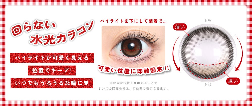 「Candy Veil(キャンディベール)」と「Chuchu Cherry(チュチュチェリー)」の2色は「回らない水光カラコン」となっており、ハイライトが可愛く見える位置をキープします。