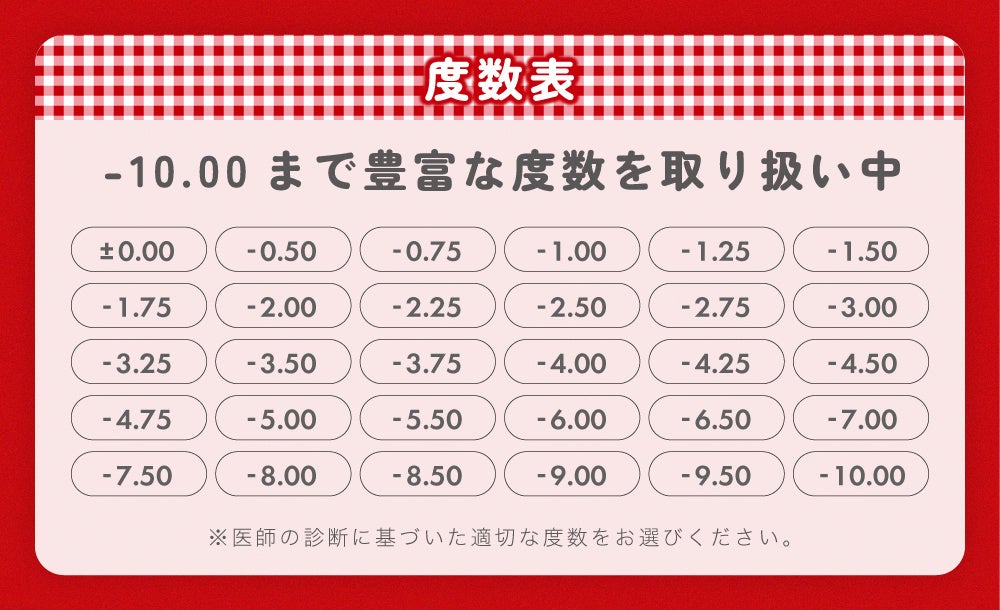度なし(±0.00)から-10.00まで、豊富な度数展開もご用意しておりますので、幅広い度数の方にお使いいただけます。