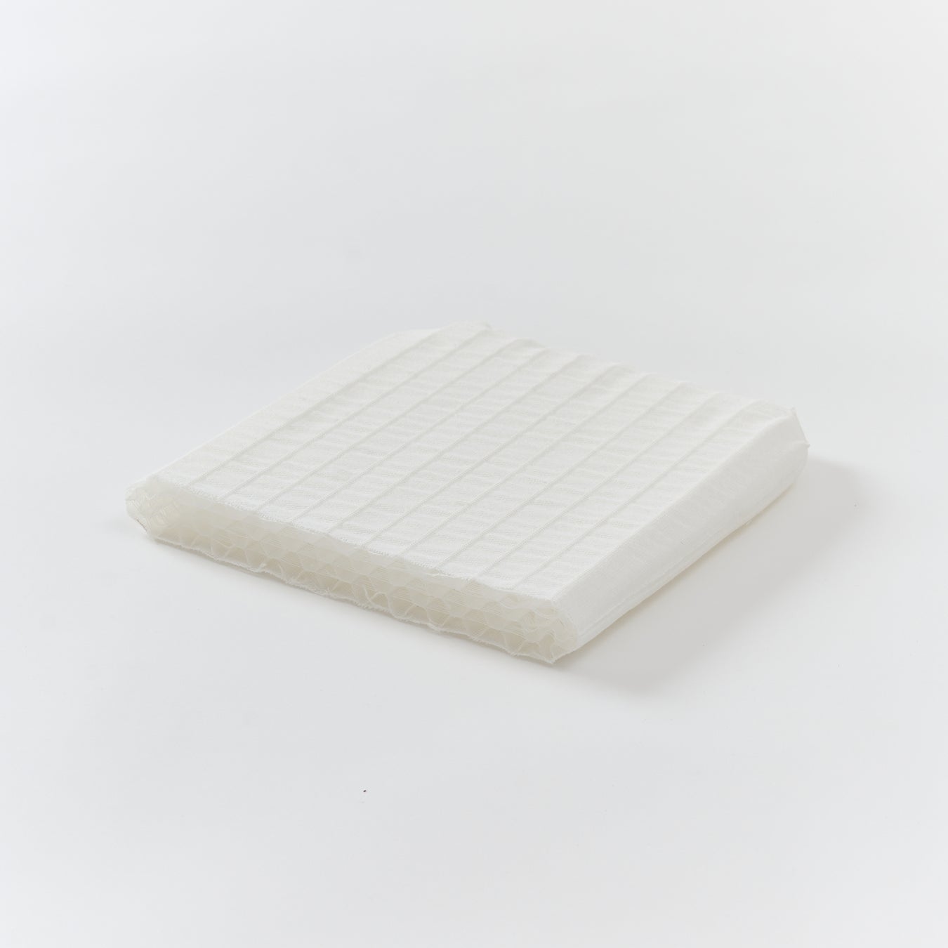 多層織物クッション材は、横方向がトンネル構造の為、空気が水平方向に流れ、通気性に優れます。