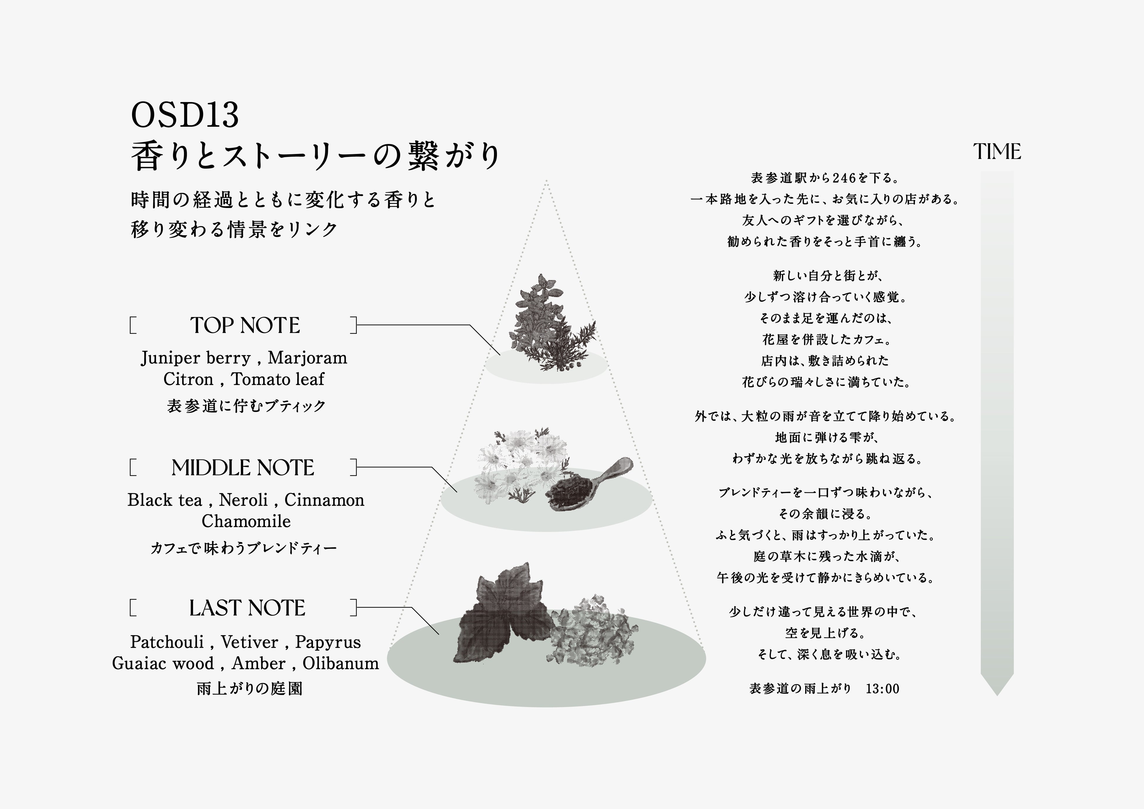 OSD13 は、表参道の13時に広がる、何気ないワンシーンを切り取った香りです。