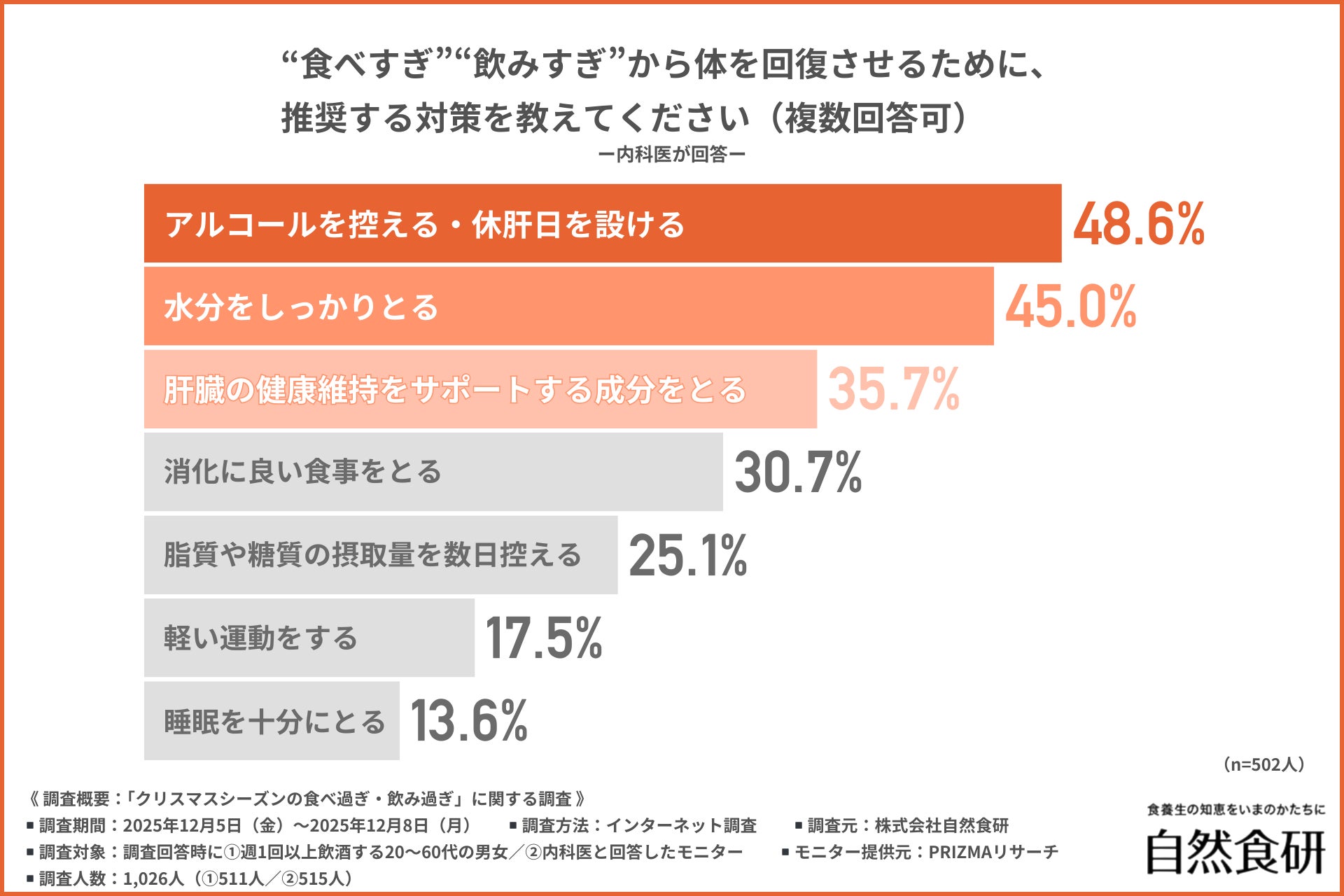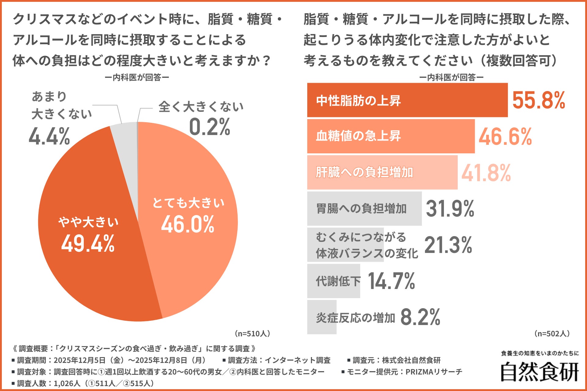 そこで今回、株式会社自然食研(https://www.sizenshokken.co.jp/)は、①週1回以上飲酒する20〜60代の男女/②内科医を対象に、「クリスマスシーズンの食べ過ぎ・飲み過ぎ」に関する調査を行いました。