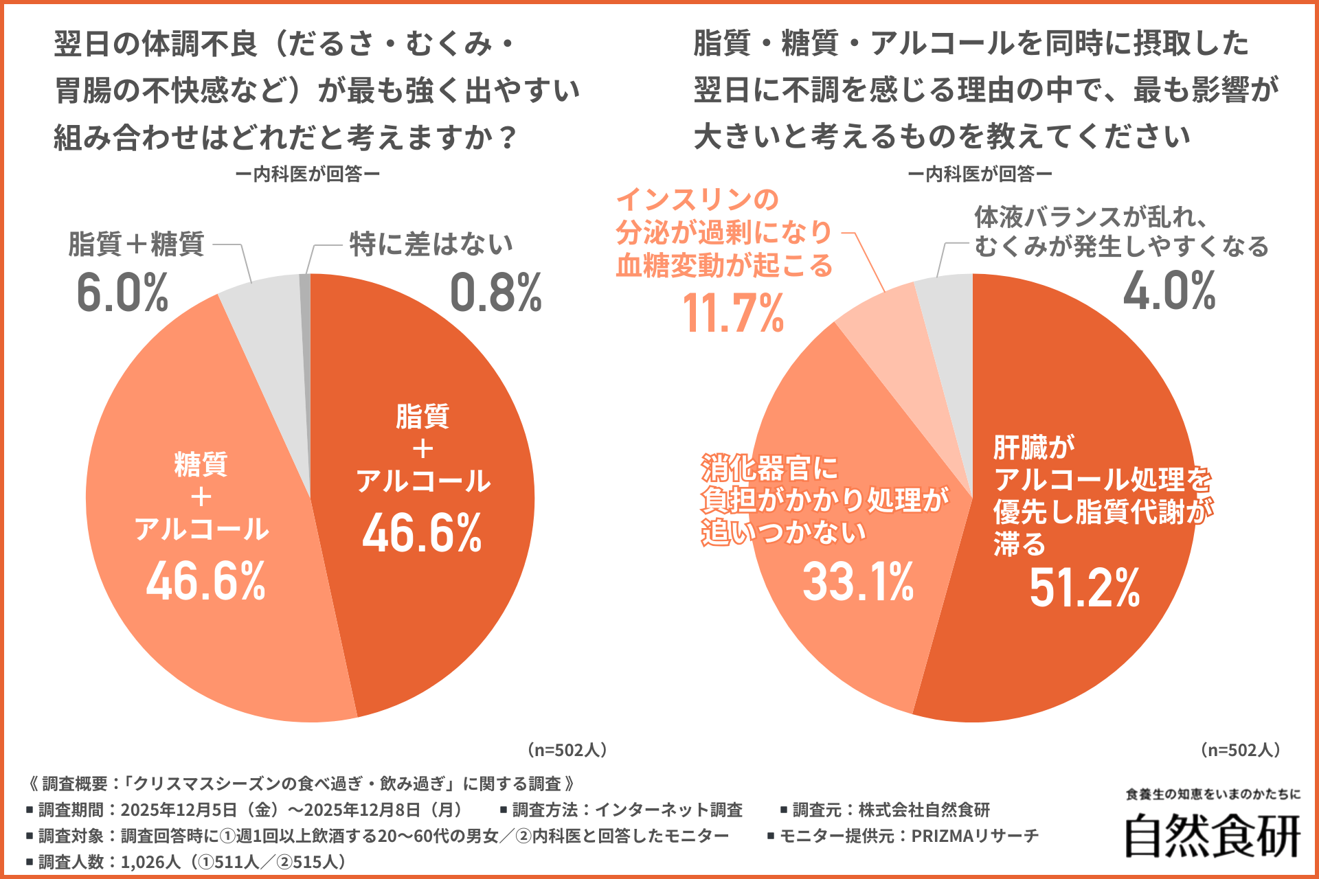 そこで今回、株式会社自然食研(https://www.sizenshokken.co.jp/)は、①週1回以上飲酒する20〜60代の男女/②内科医を対象に、「クリスマスシーズンの食べ過ぎ・飲み過ぎ」に関する調査を行いました。