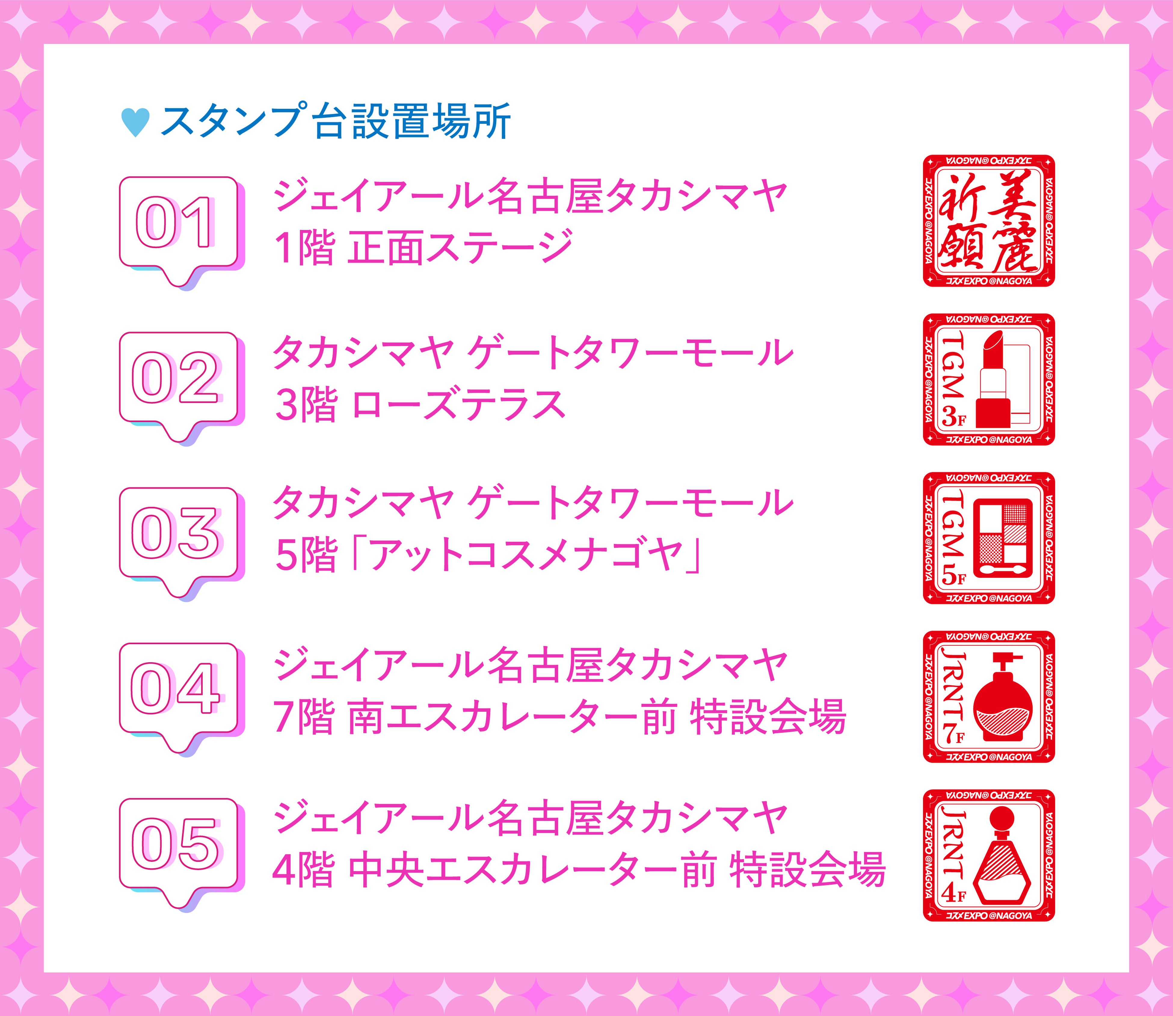 ジェイアール名古屋タカシマヤ 1階 正面ステージを起点に、ジェイアール名古屋タカシマヤ、タカシマヤ ゲートタワーモールの各階に設置されたスタンプを御朱印帳に押印
