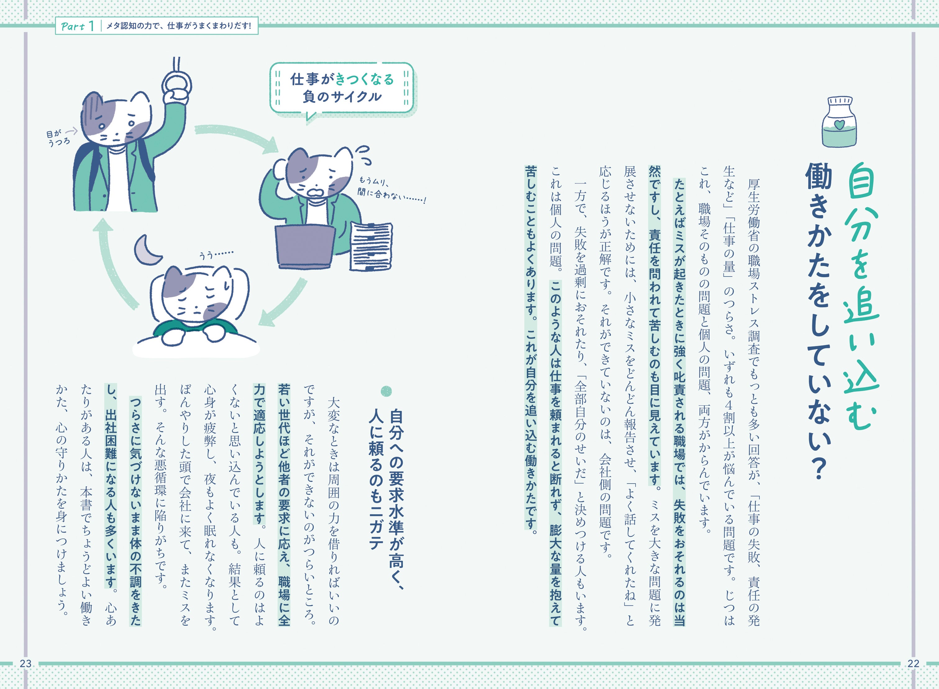 例えば仕事で失敗したとき、「全部自分の責任だ」「評価もガタ落ち…」と思ってしまいがちですが、上司に相談してみたらそこまで状況は悪くなかった ということはよくあります。このような誤った認知に気づけるよう、職場での悩みについて、考え方のヒントを紹介しました。そして、どう対処していけばよいのかを、さまざまな手法を用いてやさしく解説しています。