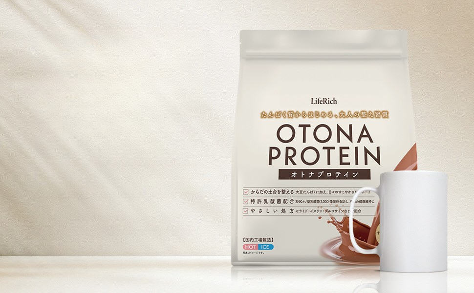 「オトナプロテイン」は、植物性ソイプロテインをベースに、特許取得の植物性ナノ型乳酸菌SNK®を1食分あたり1000億個配合しています。乳酸菌には加熱処理された殺菌タイプを採用しており、冷たい飲み方だけでなく、ホットでも取り入れやすい設計としました。