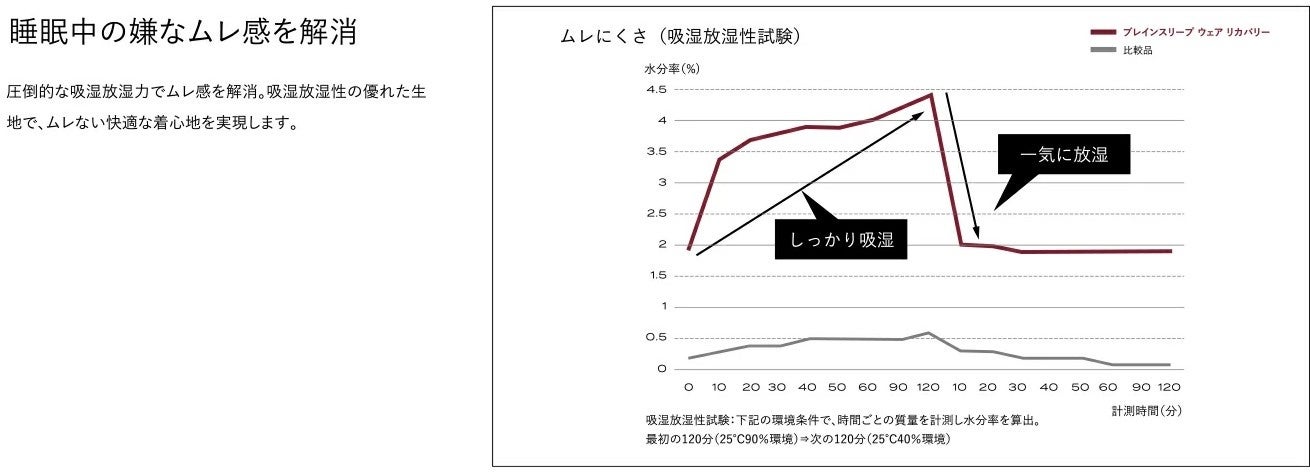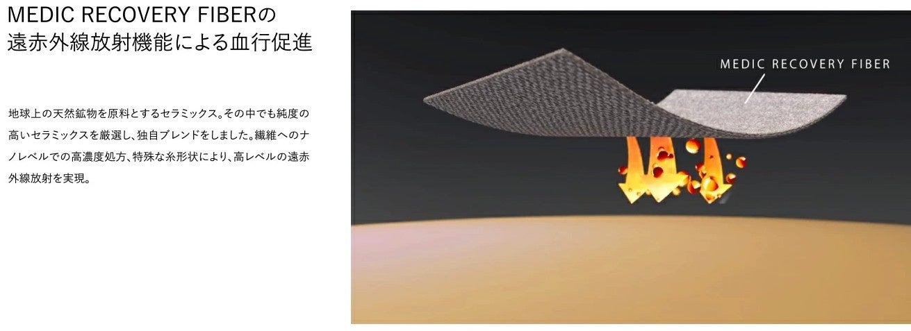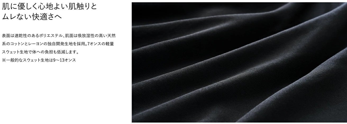 表面は速乾性のあるポリエステル、肌面は吸放湿性の高い天然系コットンとレーヨンの独自開