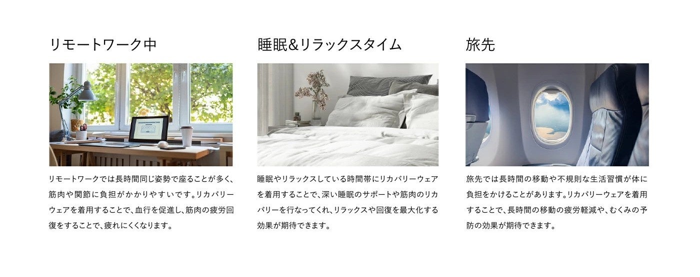 長時間同じ姿勢で座る場面が多いリモートワークやオフィスでの作業、旅先での長時間移動などで着用することによって、更なる疲労軽減が期待できます。