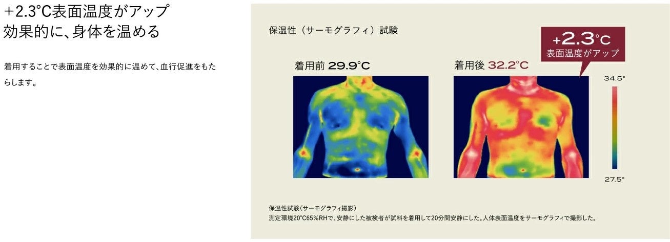 表面は速乾性のあるポリエステル、肌面は吸放湿性の高い天然系コットンとレーヨンの独自開