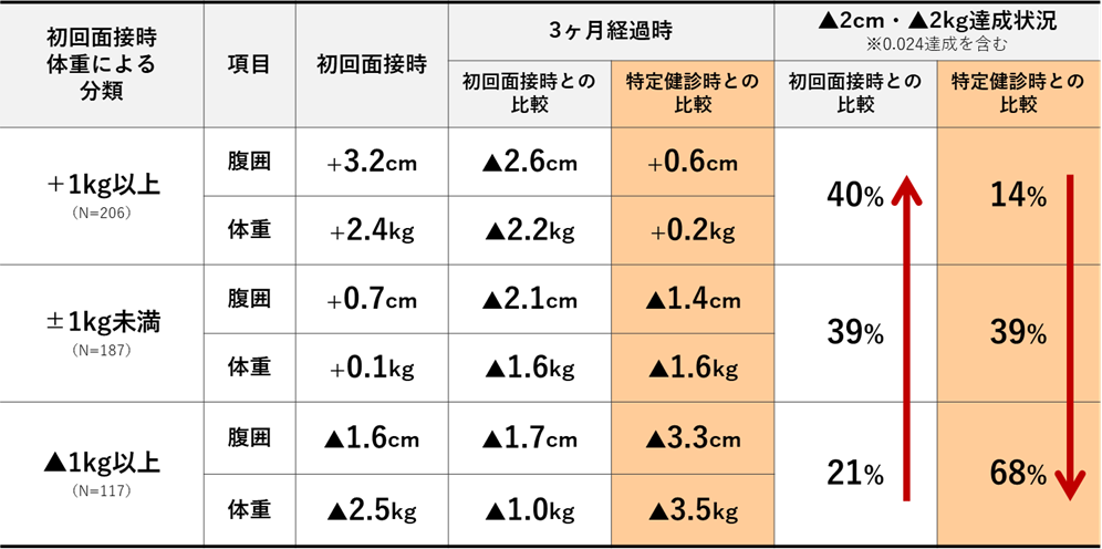 初回面接時点で腹囲・体重が増加している対象者は、主要達成目標の達成が難しくなる傾向が見られる一方で、特定保健指導による介入後には体重減少などの改善が認められるケースが多いことが確認されました。