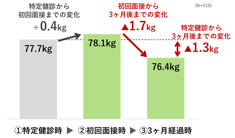 この分析に用いたデータ(N=510)における「特定健診受診日から初回面接実施日までの所要日数」は平均202日(約6~7か月)であり、この期間の影響によって、初回面接時点の腹囲・体重は、特定健診時の数値から変動しているケースが少なくないことが明らかになりました。実際に、特定健診時と初回面接時の体重を比較すると、平均で+0.4kg増加している傾向が認められています。