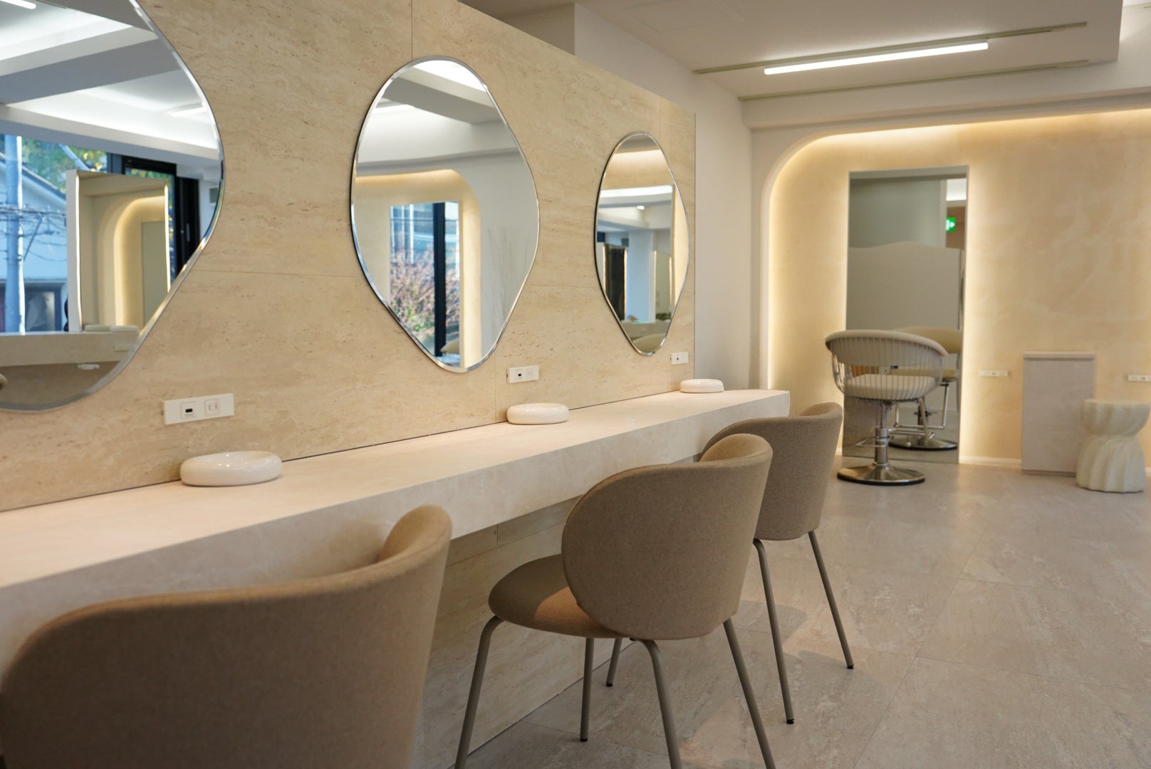 リニューアル後のメインフロアは、白とナチュラルストーンを基調とした柔らかなトーンで構成。大きな窓から自然光が差し込む開放感ある空間に、ゆったりと配置されたセット面9席とメイク直しなどゆっくりと出来るコールドスペース3席が並びます。