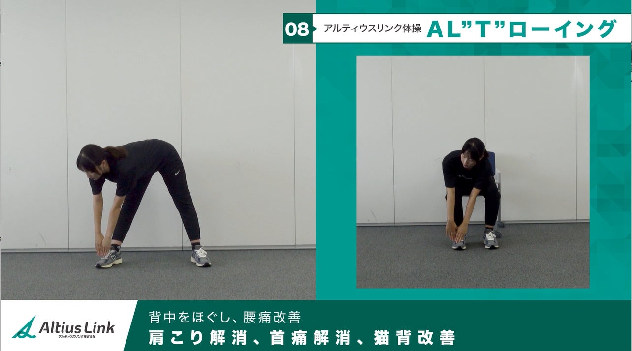 ・ALっとチェストオープン: 首や肩をほぐし、猫背の改善にも繋がる動きで、眼精疲労を和らげます。