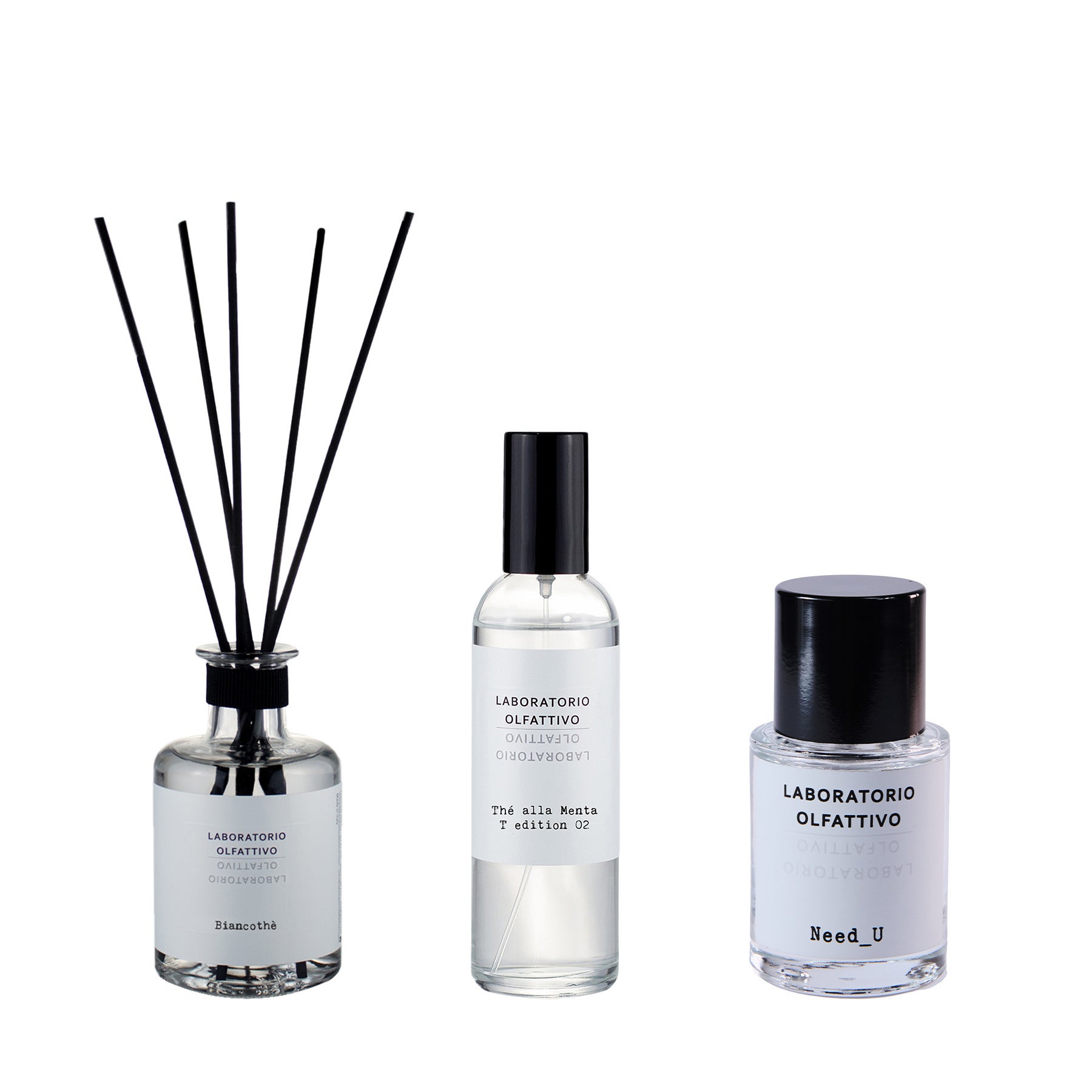 Laboratorio Olfattivoの日本限定のルームスプレーに加え、人気のディフューザーとお好きなオードパルファム(30ml)1種をお選びいただける豪華なセット。
