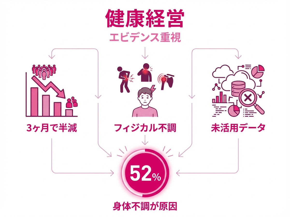 さらに、プレゼンティーイズム(健康の問題を抱えつつも出勤し仕事を行っている状態)による損失のうち、約52%がフィジカル領域に起因するとされており、「カラダの不調にどう向き合い、構造的に減らしていくか」 が、健康経営の中心テーマになりつつあります。