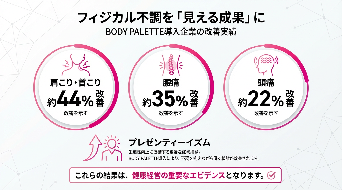 これらの数値は、プレゼンティーイズムの大きな要因であるフィジカル不調をどれだけ減らせるかという観点で、健康経営の成果を説明する際の重要なエビデンスとなります。