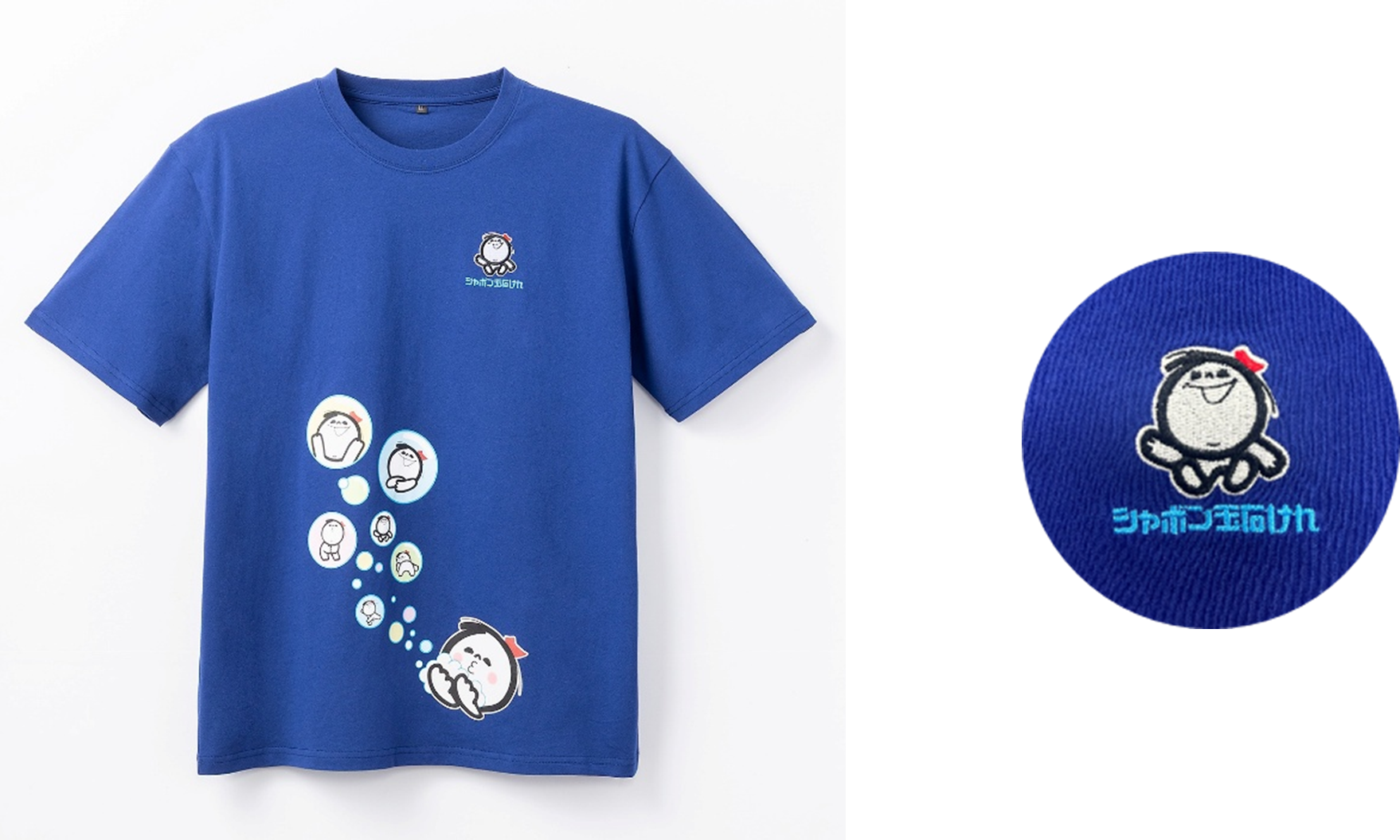 今回のT シャツはシャボン玉石けんのイメージカラーであるブルーを基調とし、表にはイメージキャラクターであるシャボンちゃんの刺繍・プリントがあしらわれています。地元である九州への感謝の気持ちと手に取る人を笑顔にしたいという想いを込めて、シャボンちゃんの色々な表情・ポーズが楽しめるデザインに仕上がっています。