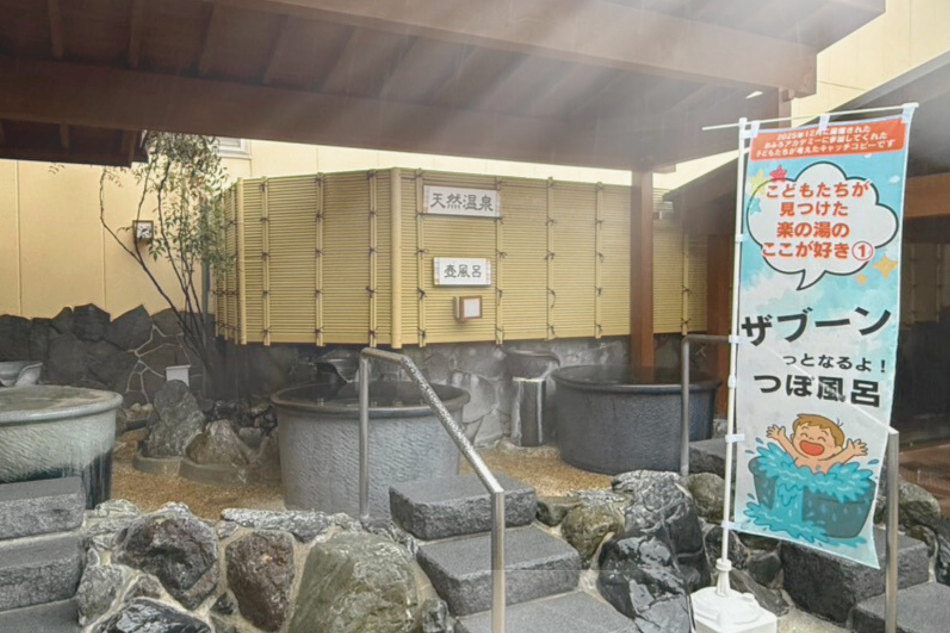 WSで採用された子どもコピーは、学びの成果をそのまま のぼりとして製作し、12月28日より浴室・館内での掲出を開始しました。