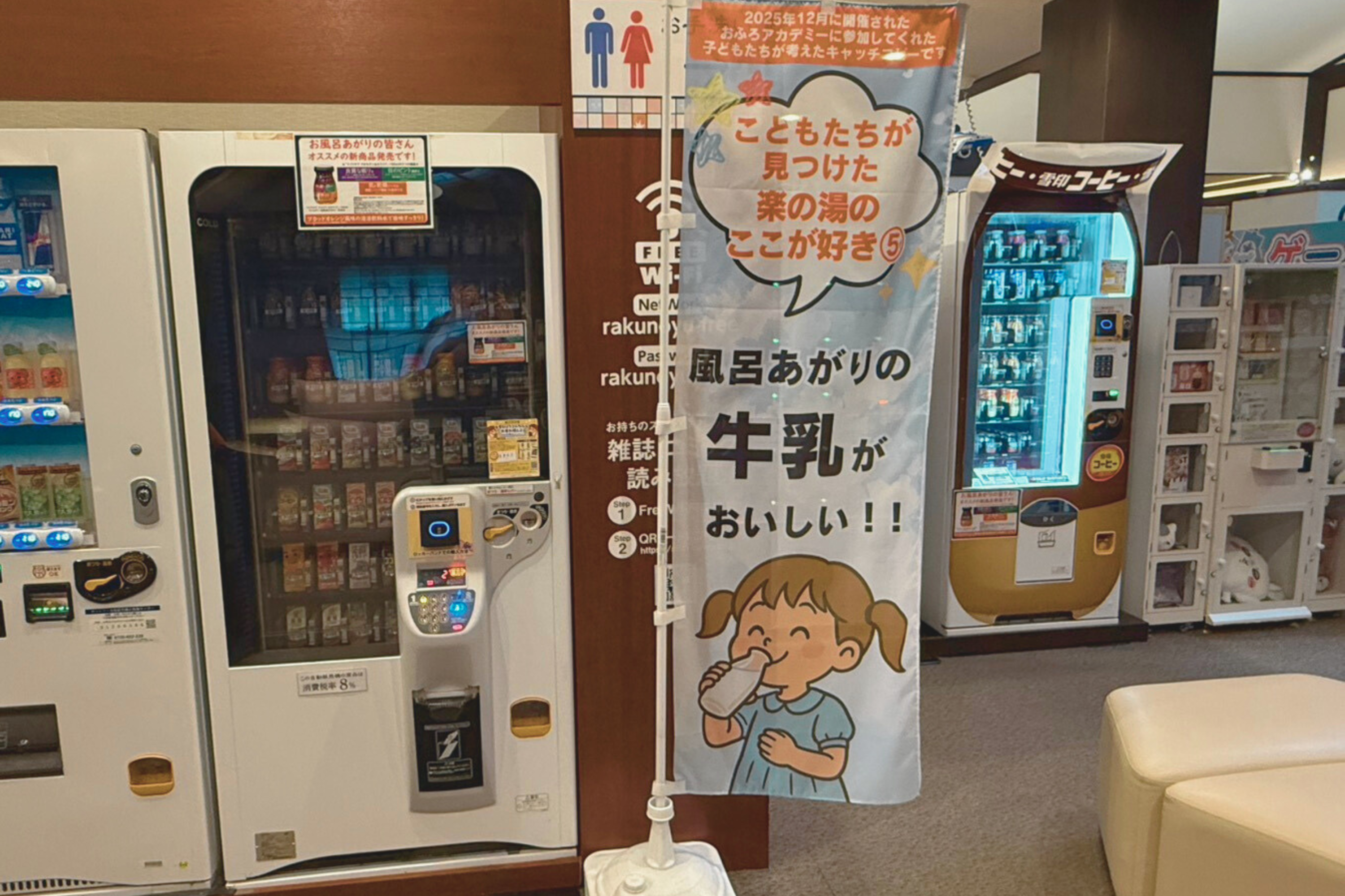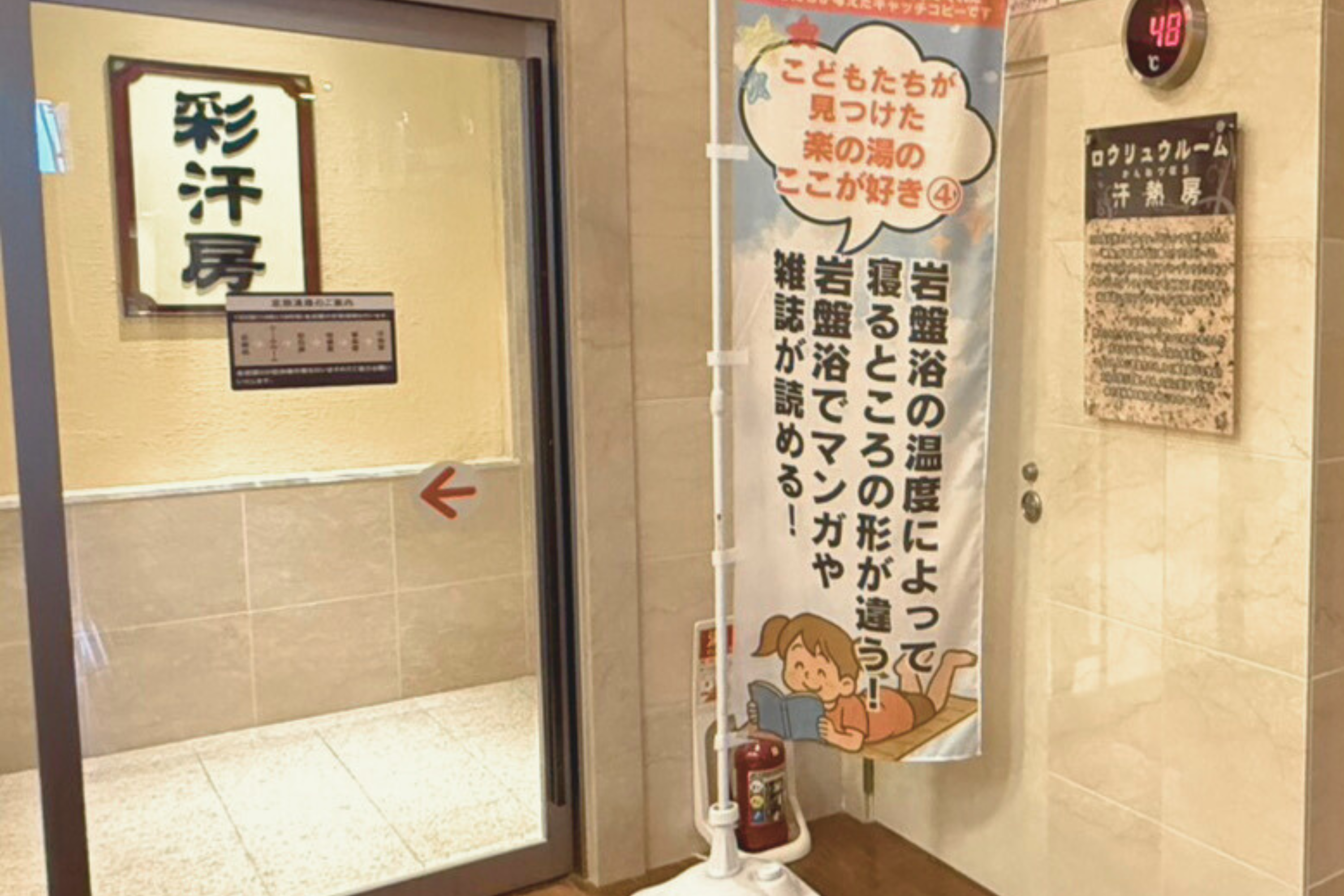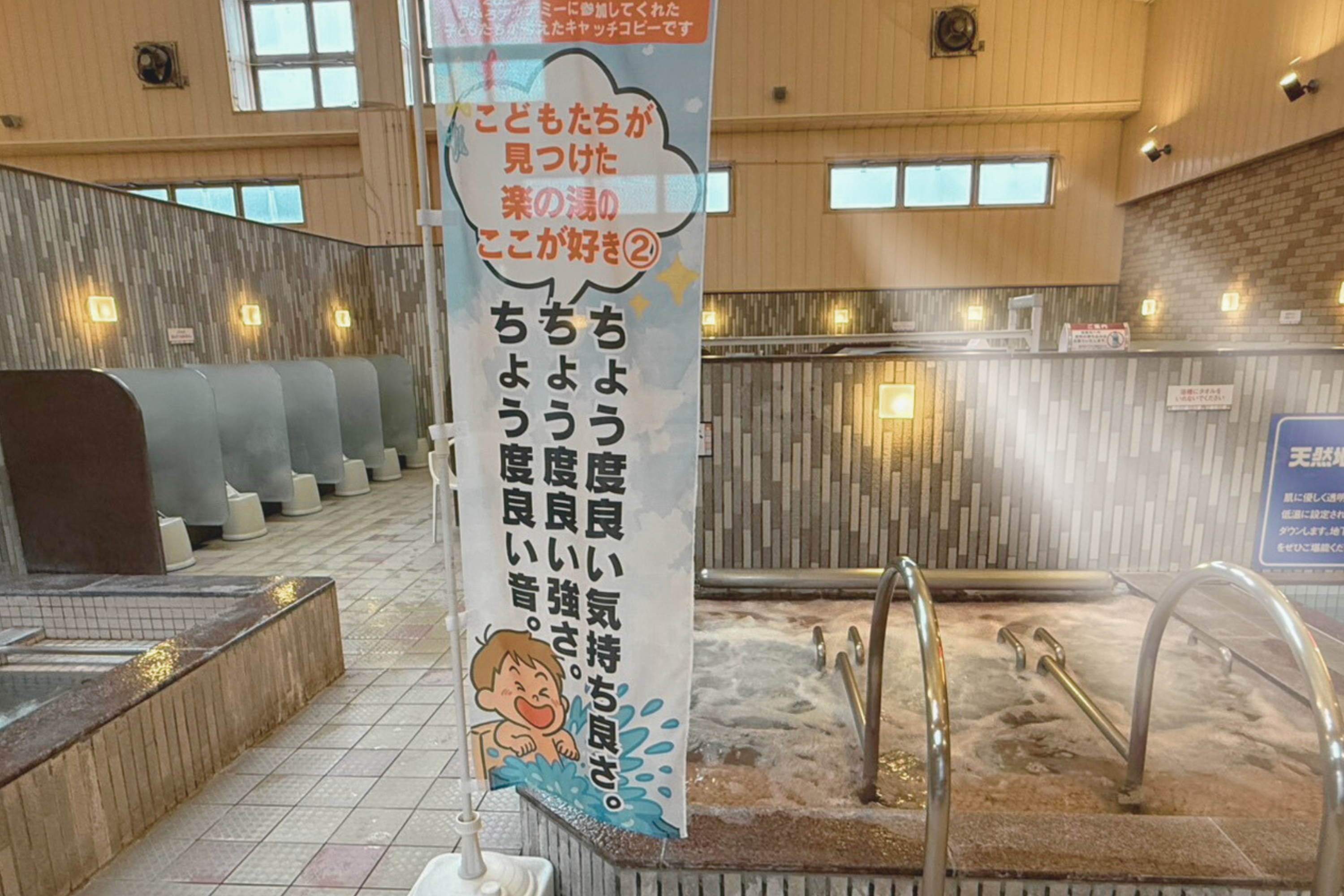 飛行機が望める天然温泉 こまき楽の湯ワークショップで生まれた子どもコピーを のぼりとして製作し、浴室と館内へ掲げました