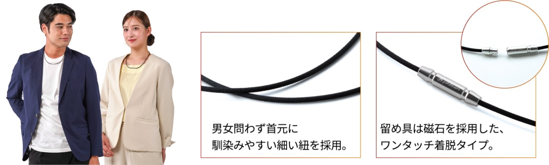 筋肉のコリ・張りをほぐす「ナノメタックス」を紐部分に採用したネックレス