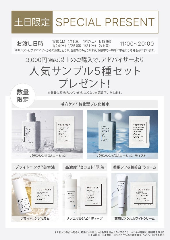 ビューティーアドバイザー在店時に限り、3,000円(税込)以上ご購入の方対象で人気商品のサンプル5種セットを配布いたします。(数量限定)