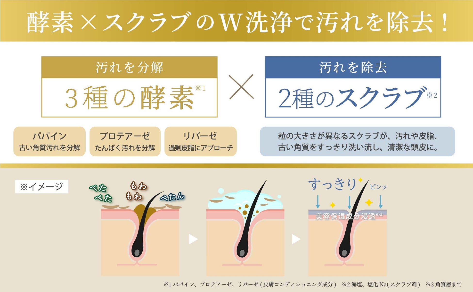 ① 酵素*¹×スクラブ*²のW洗浄で頭皮の汚れやニオイをオフ。
