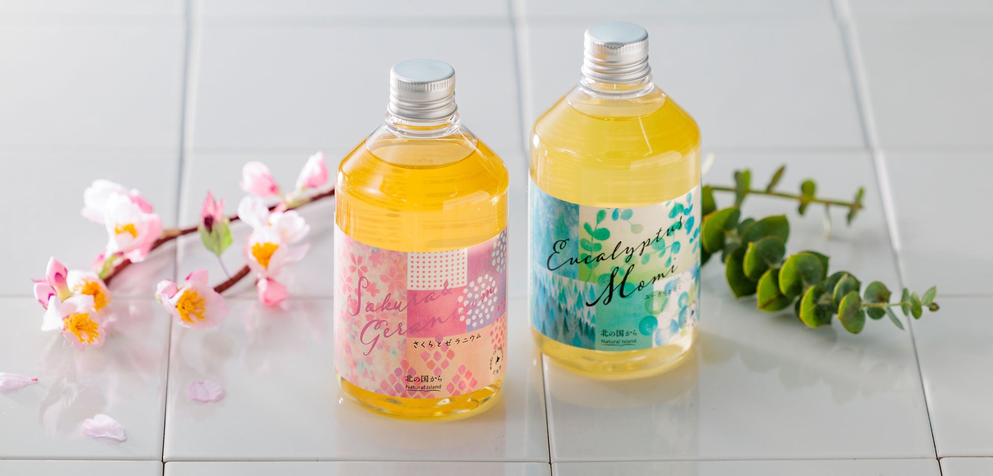 「ユーカリとモミ」は、ユーカリ精油に北海道釧路産モミ精油(トドマツ精油)とパイン精油をブレンドした、透明感のあるすっきりとした森林の香りが特徴です。一方、「さくらとゼラニウム」は、咲いてもすぐに散ってしまう八重桜の花びらエキスを使用し、ふんわりと包み込むような桜の香りにゼラニウムやハーブをブレンドした上品で優しい香りを楽しめます。季節に合ったの贅沢なバスタイムをお楽しみください。